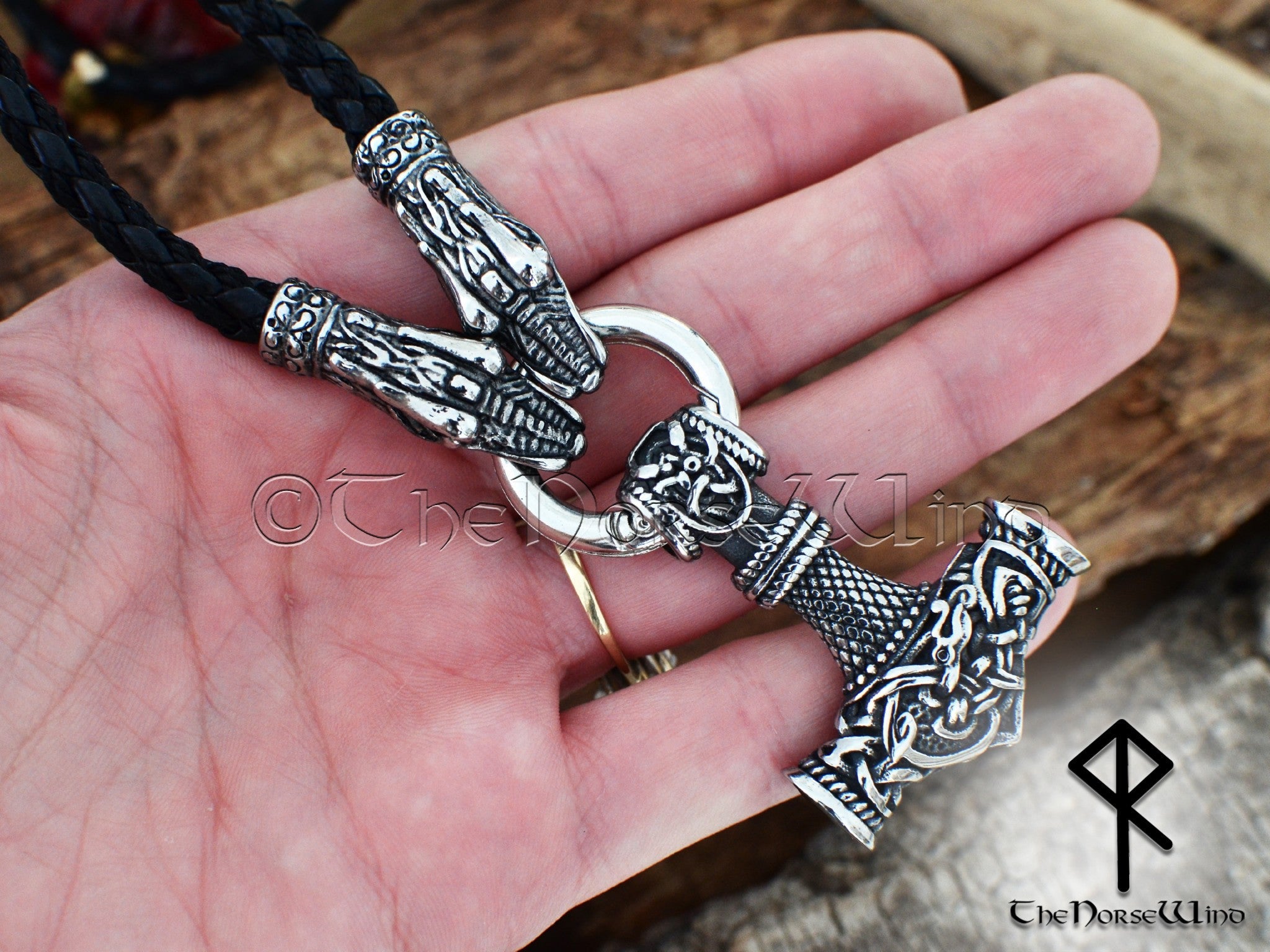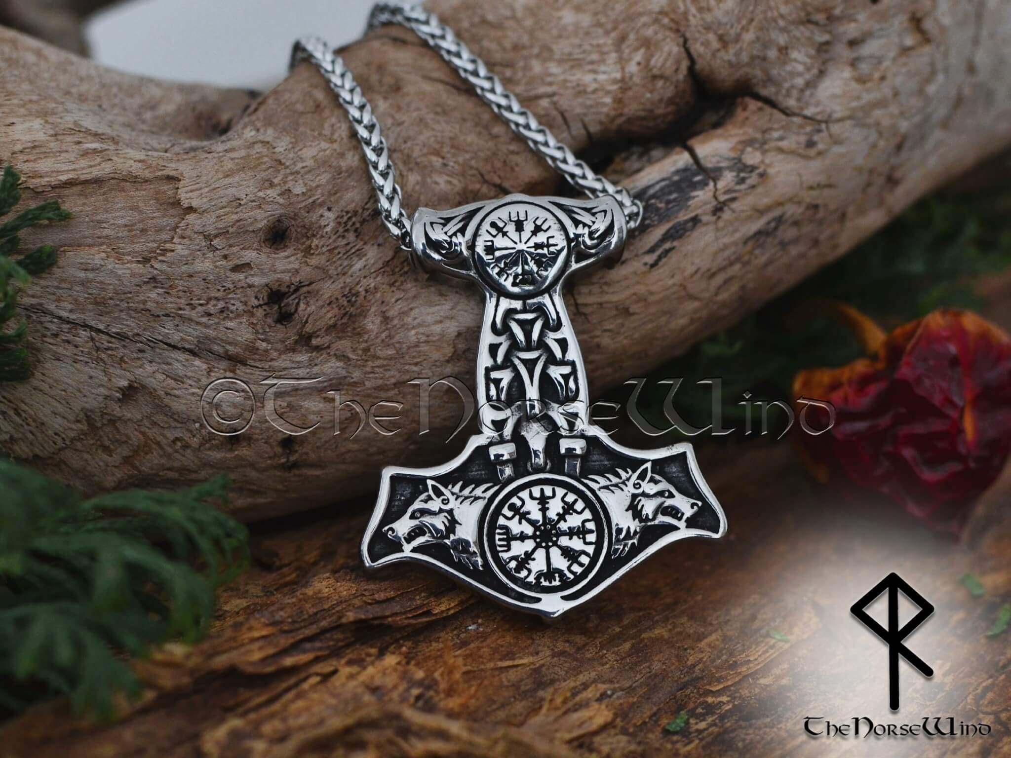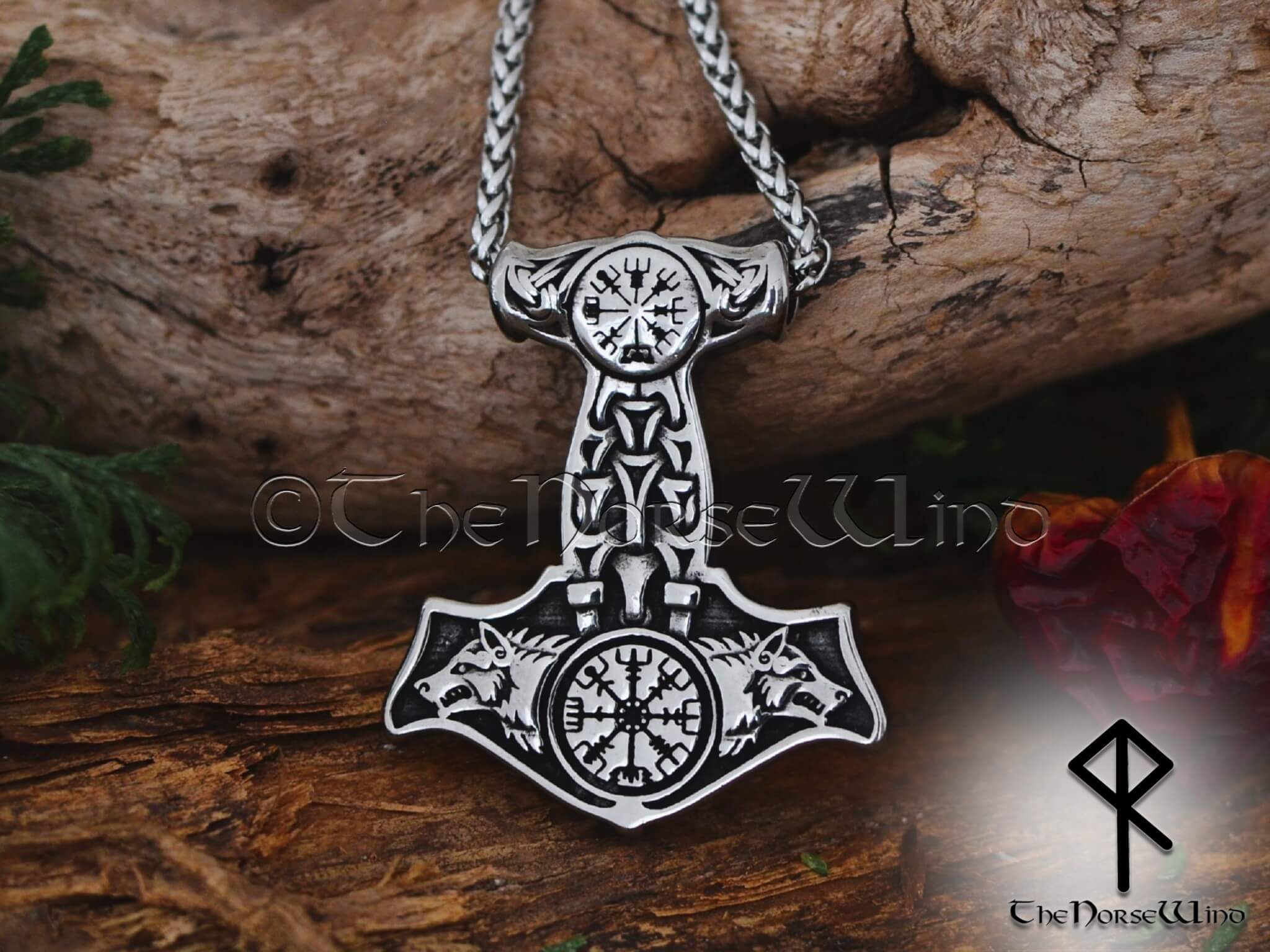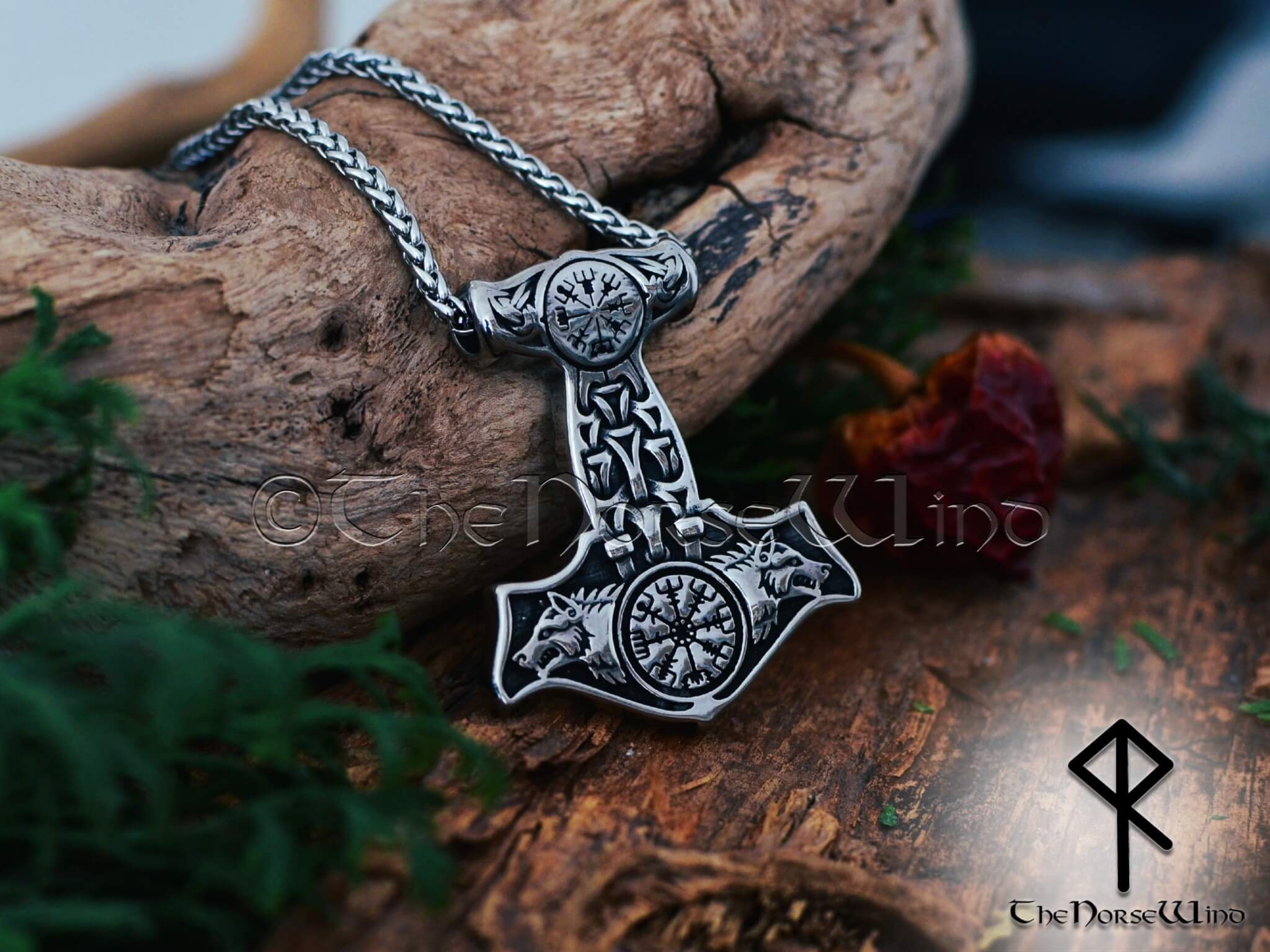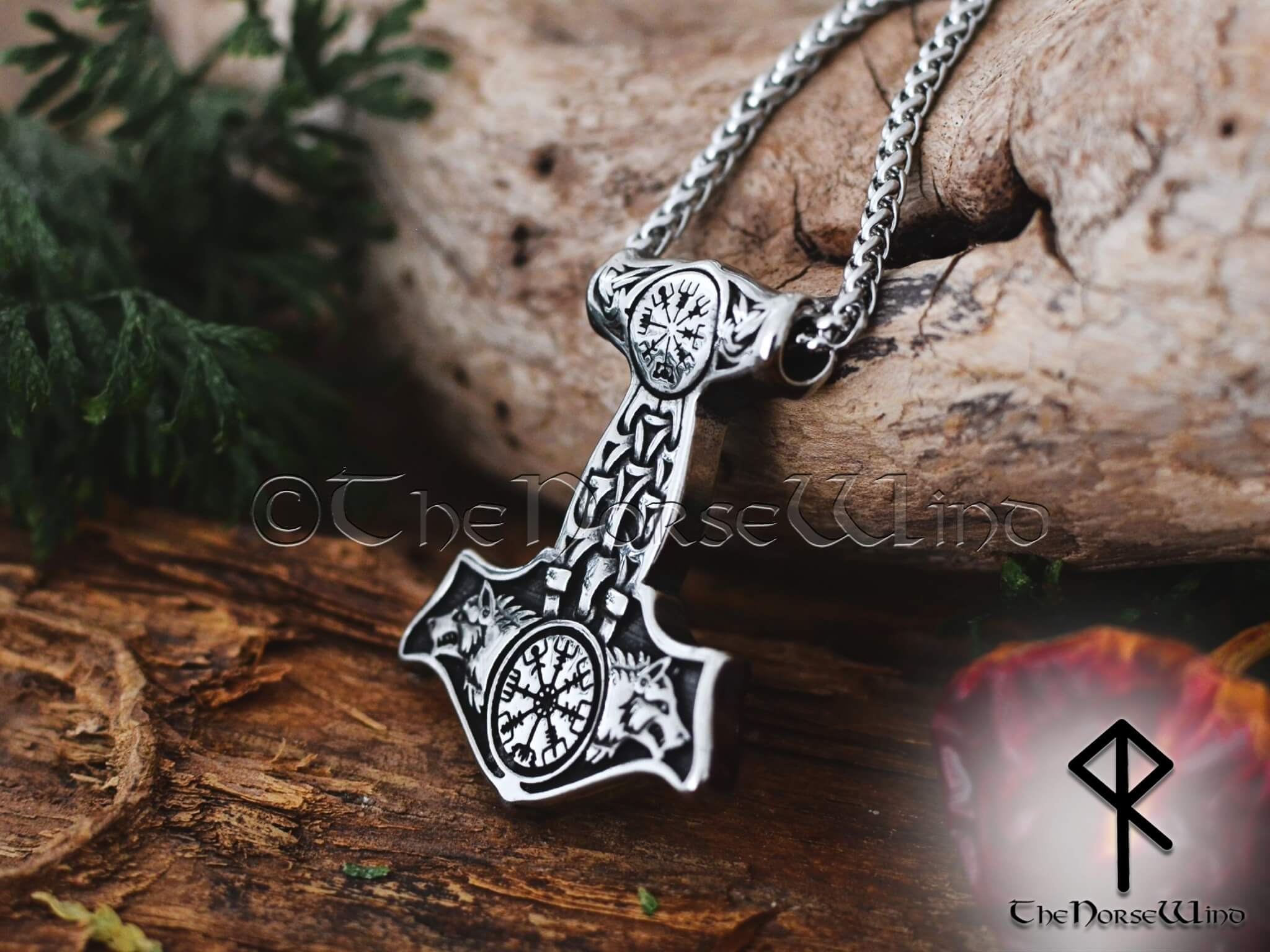 Thor's Hammer Necklace Geri & Freki Viking Wolf Mjolnir Pendant