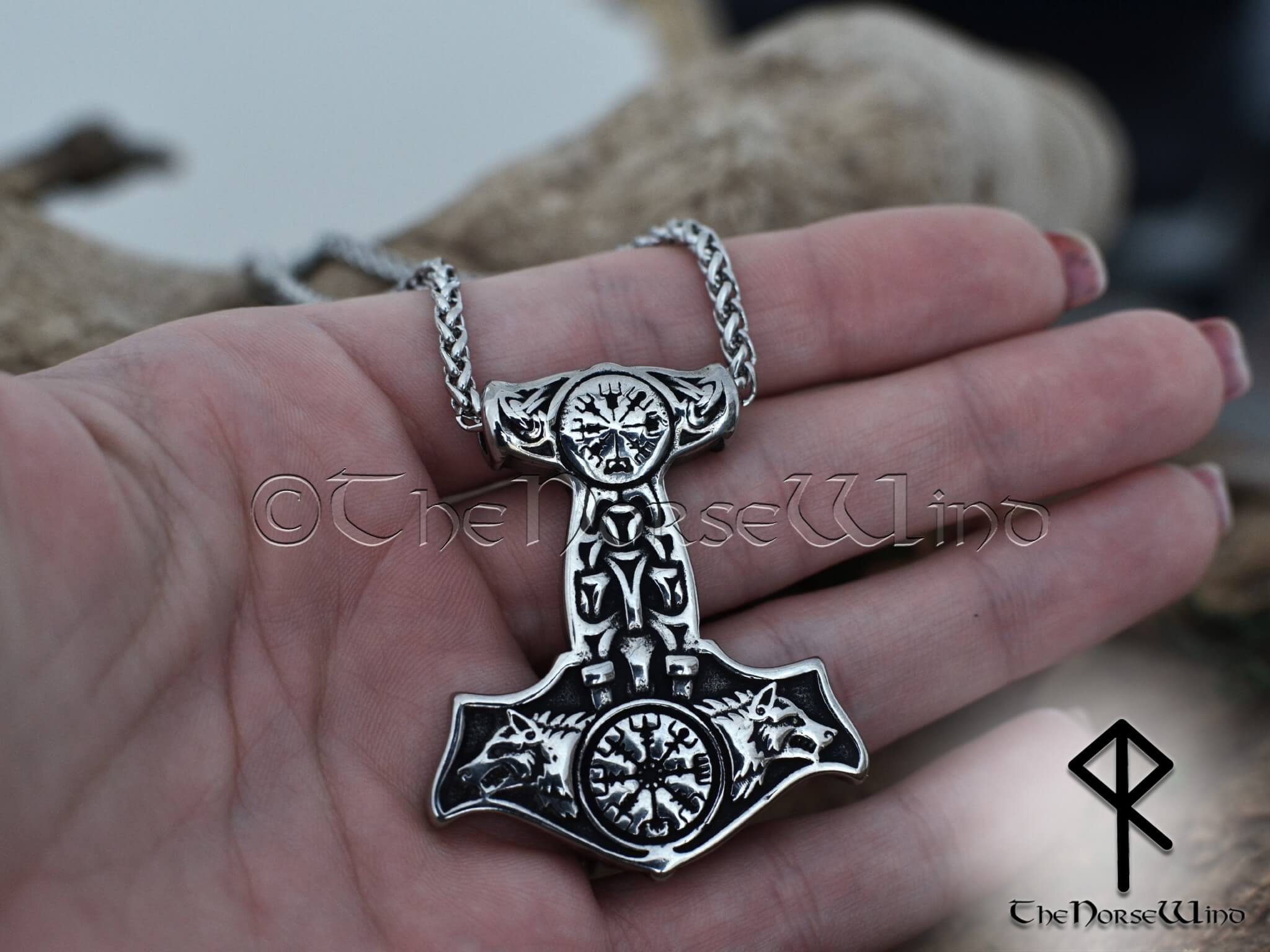 Thor's Hammer Necklace - Mjolnir with Sköll & Hati Wolf Heads, Stainless Steel Pendant