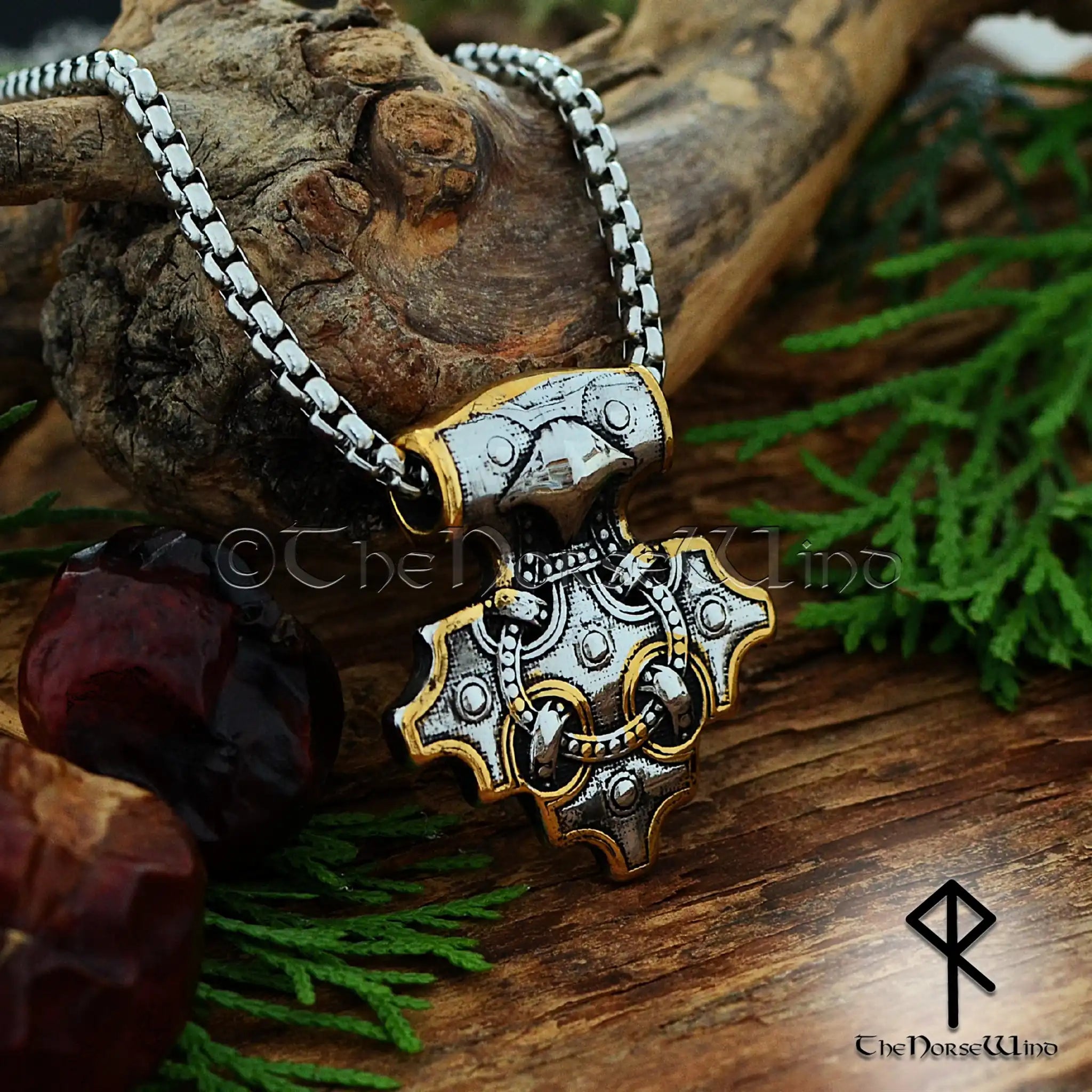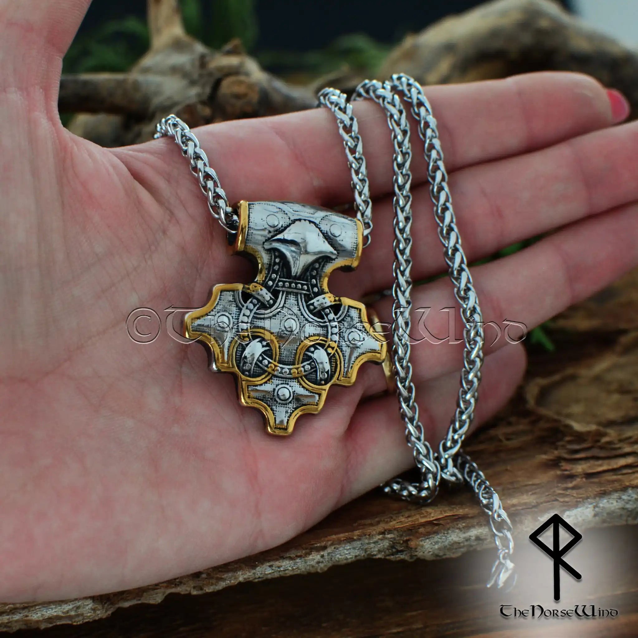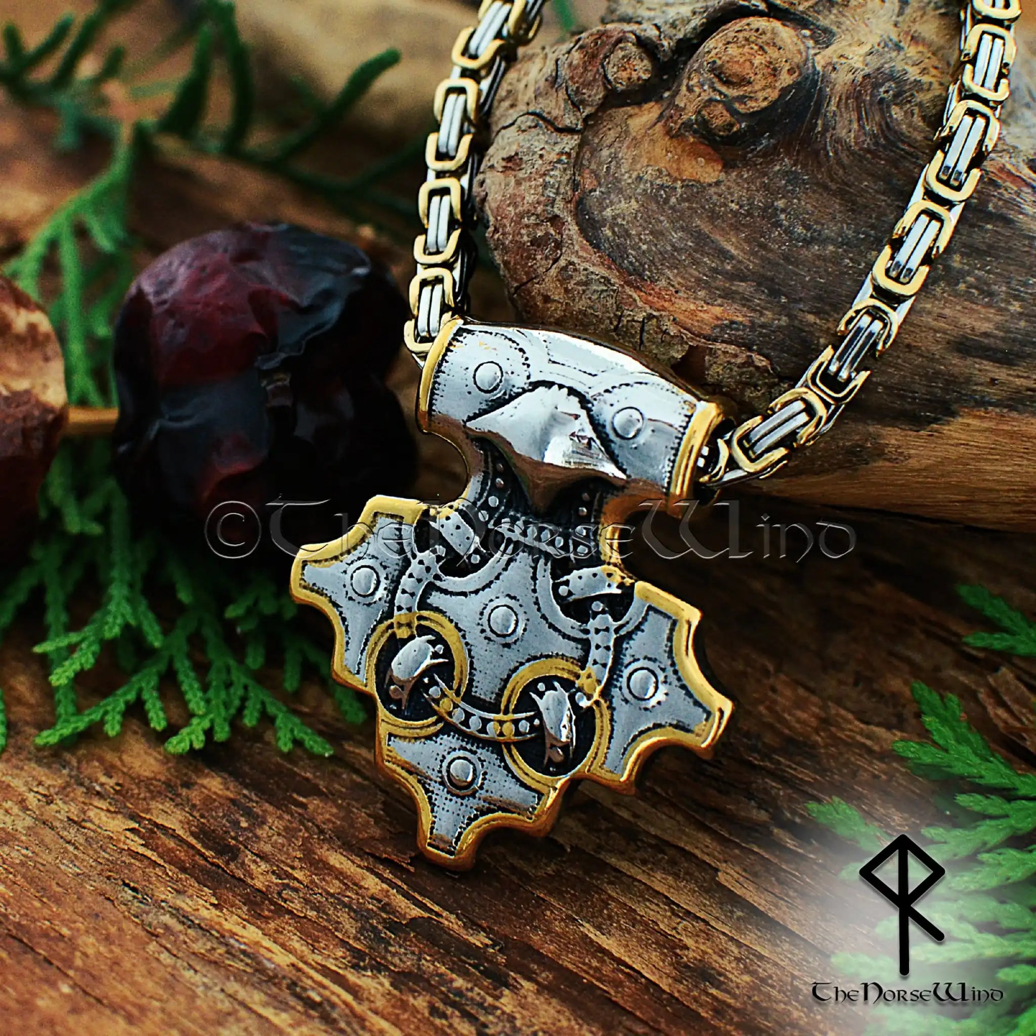 Thor's Hammer Viking Raven Necklace, Mjolnir Pendant in Silver & Gold