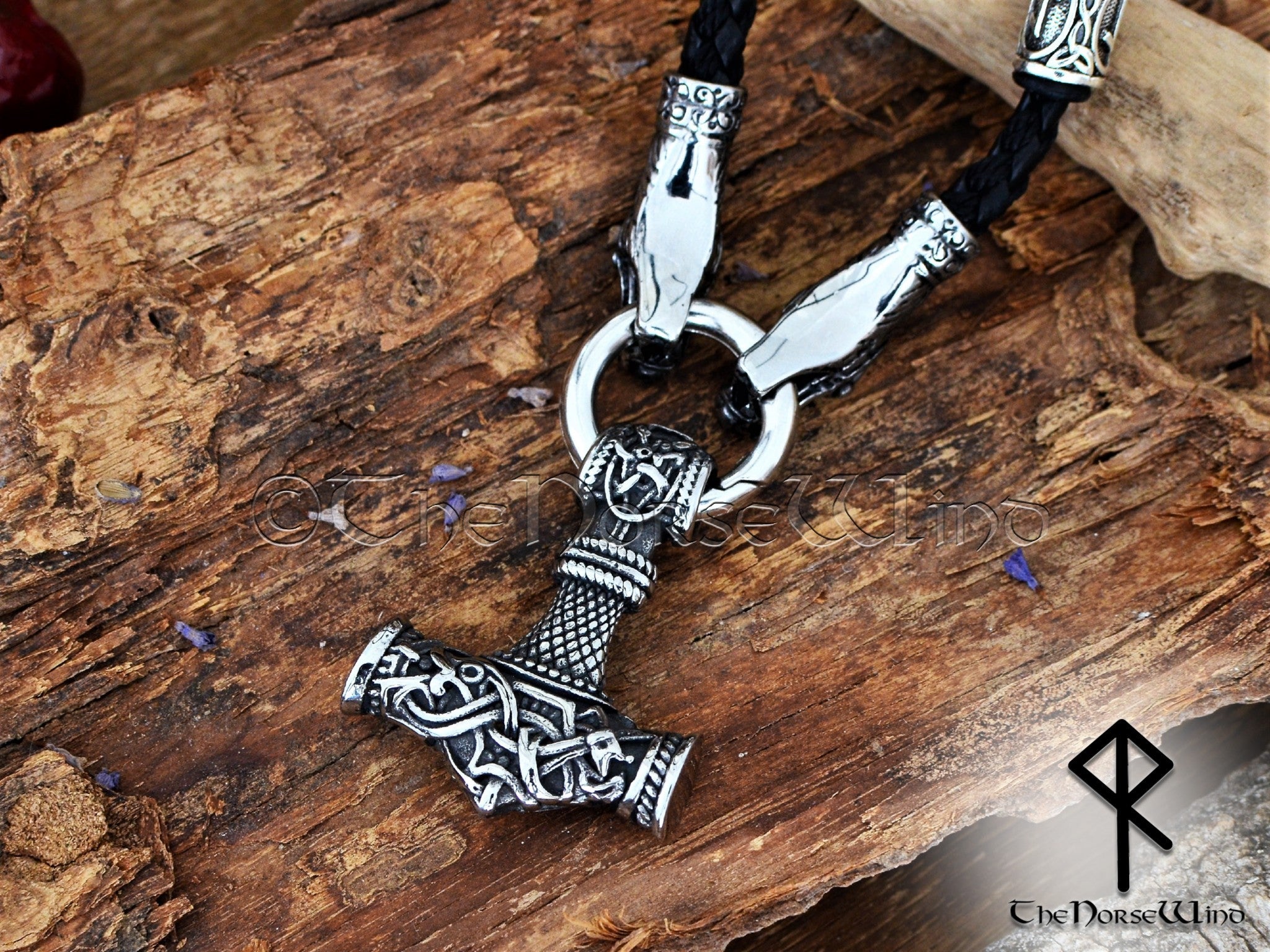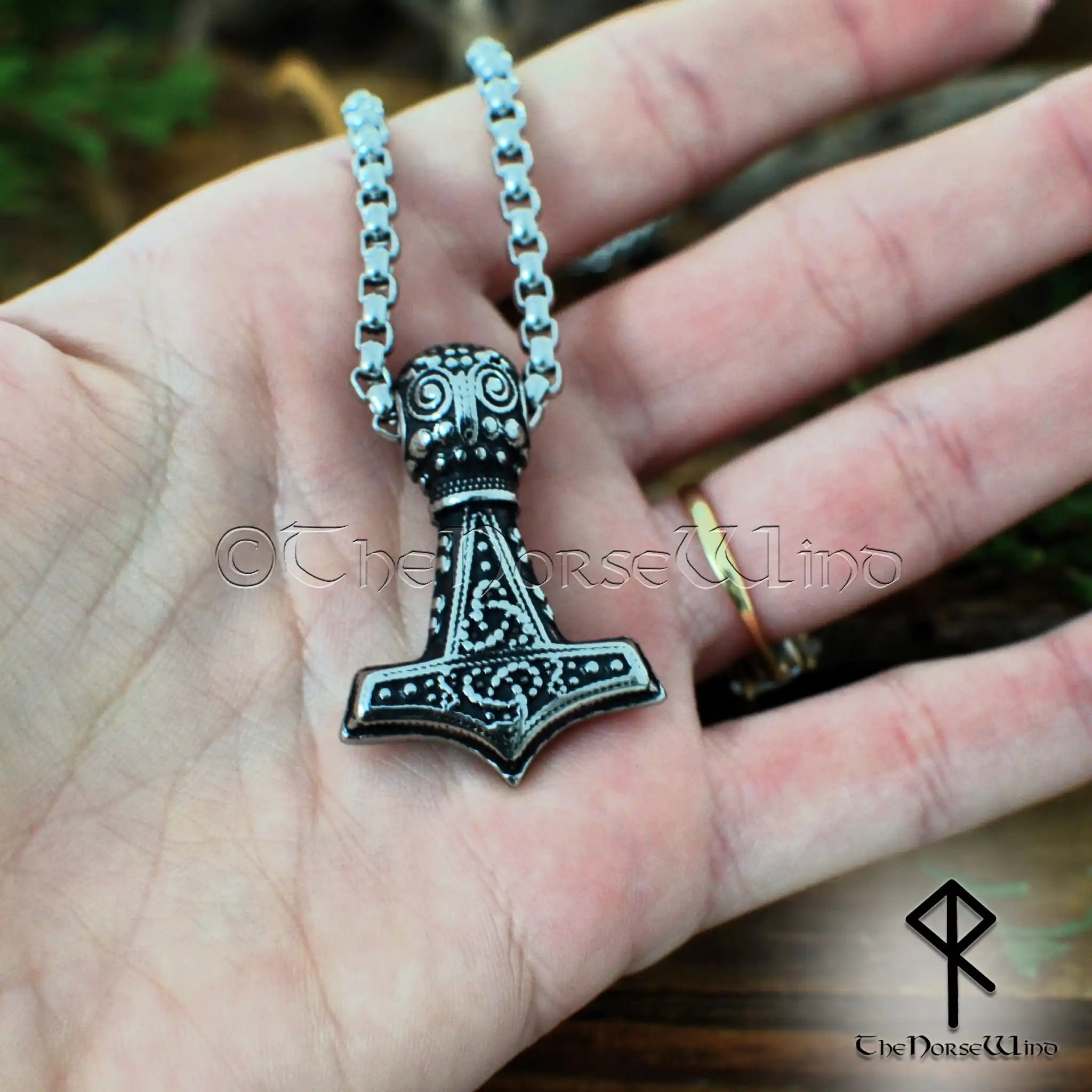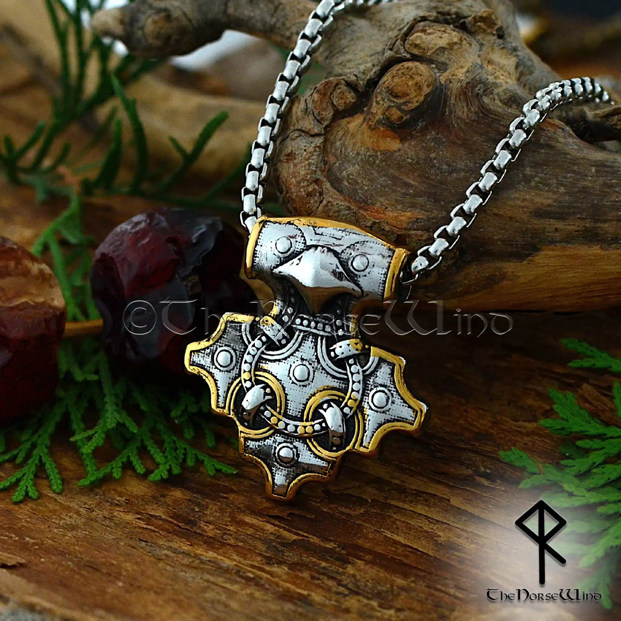 Thor's Hammer Viking Raven Necklace, Mjolnir Pendant in Silver & Gold