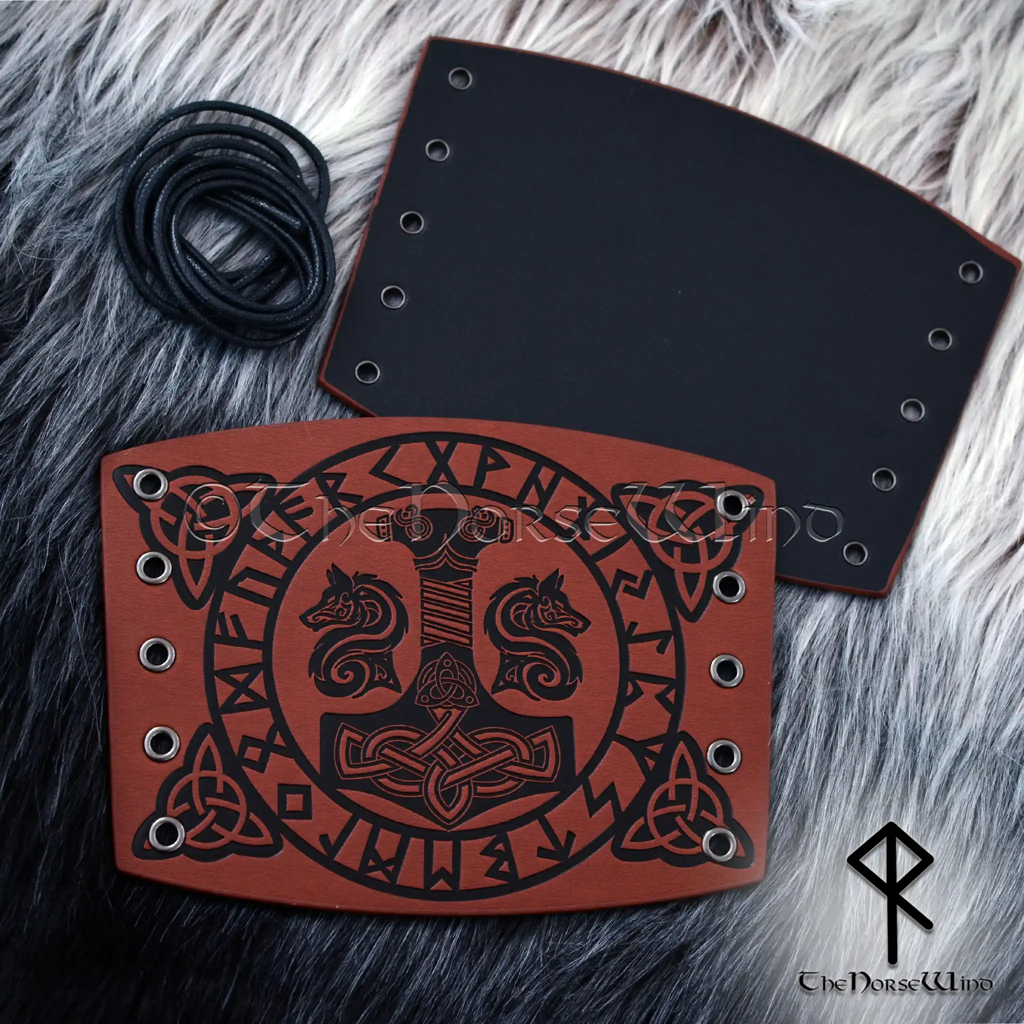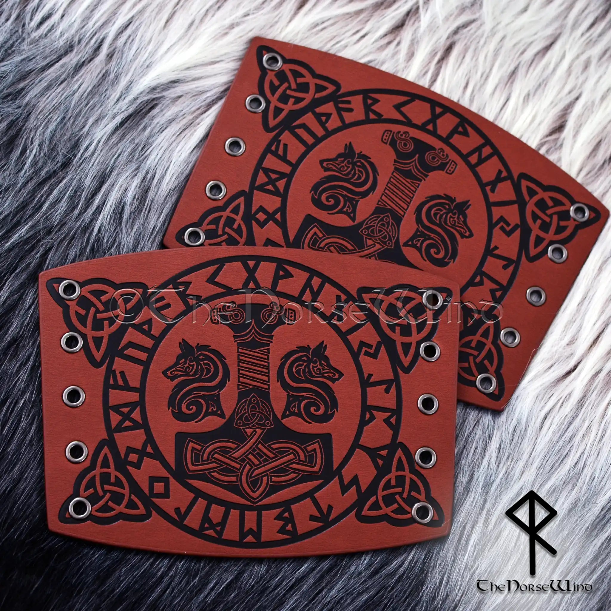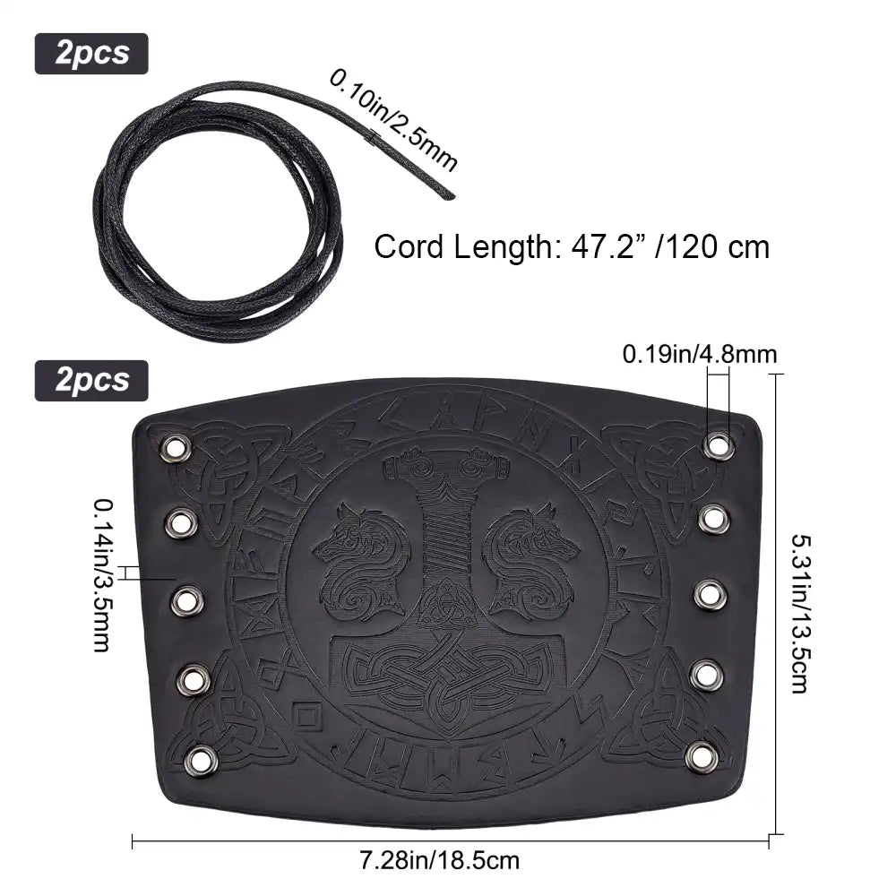 Thor's Hammer Leather Bracers, Viking Geri and Freki Wolves Vambrace