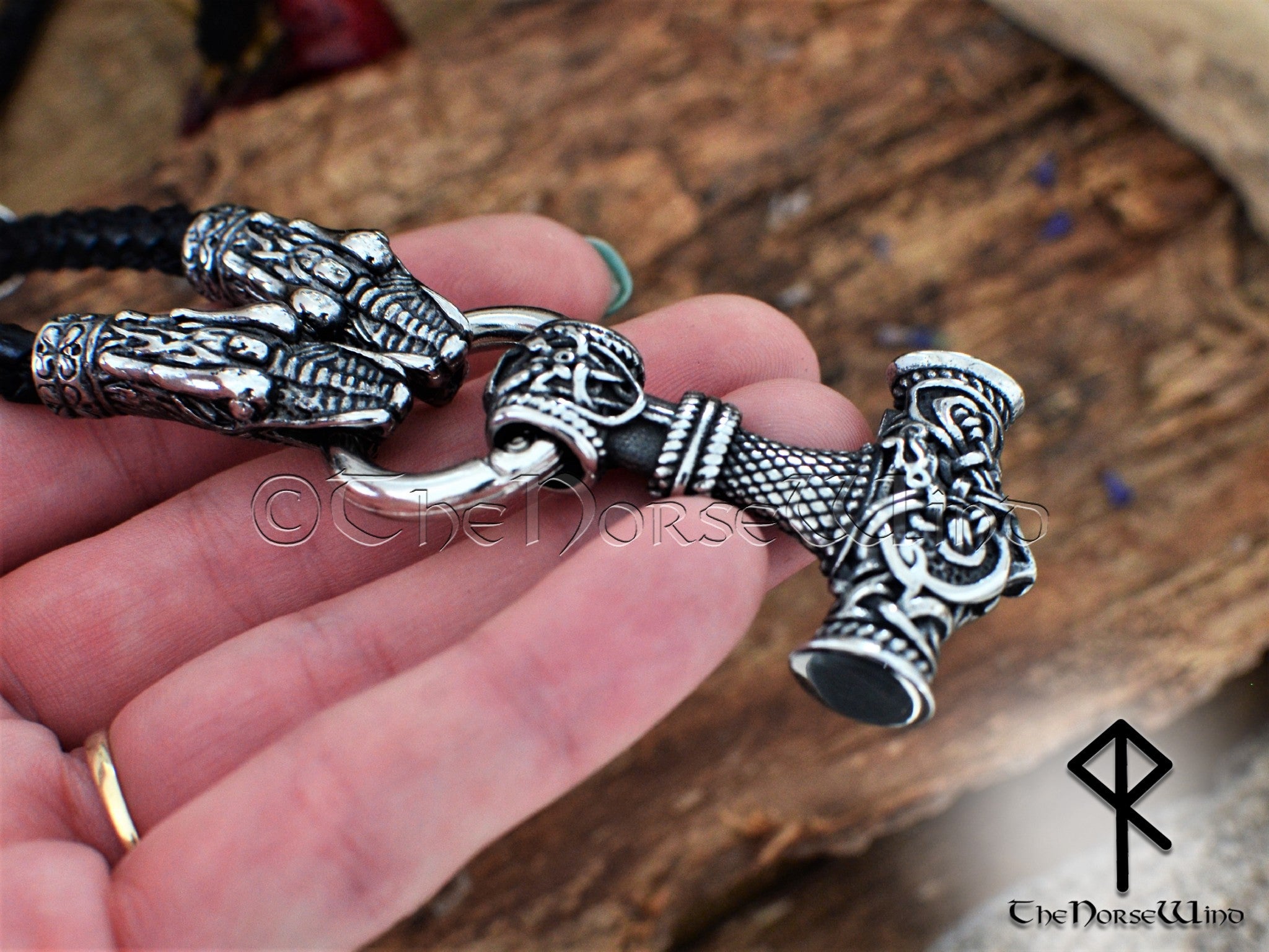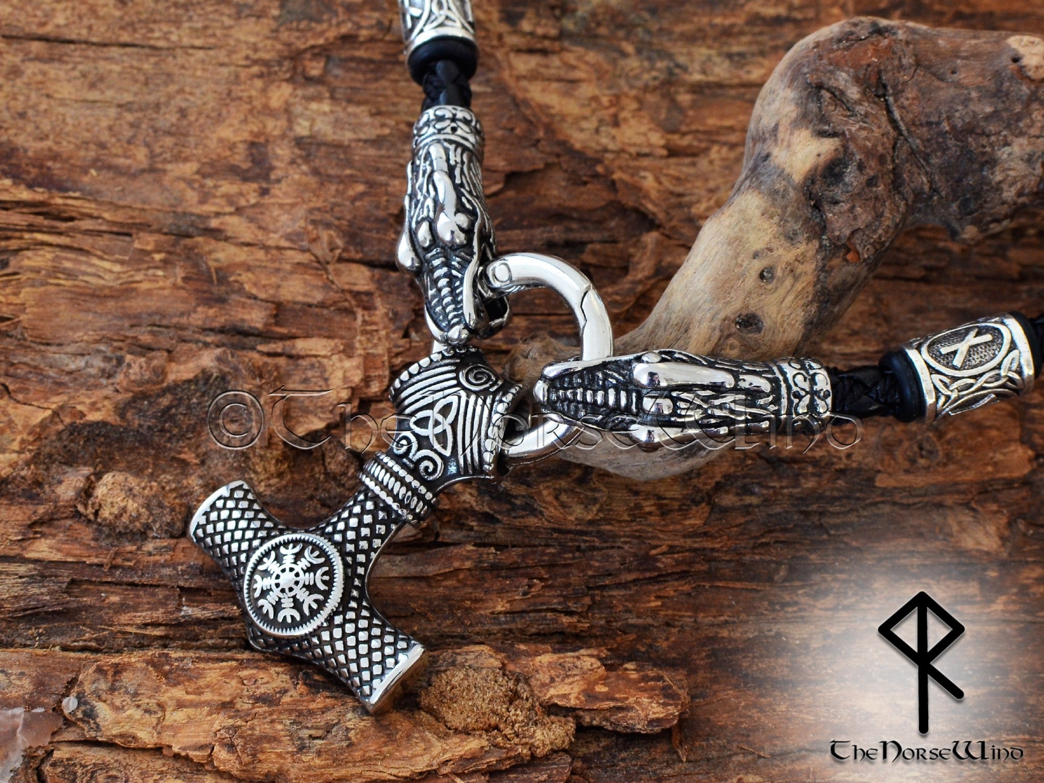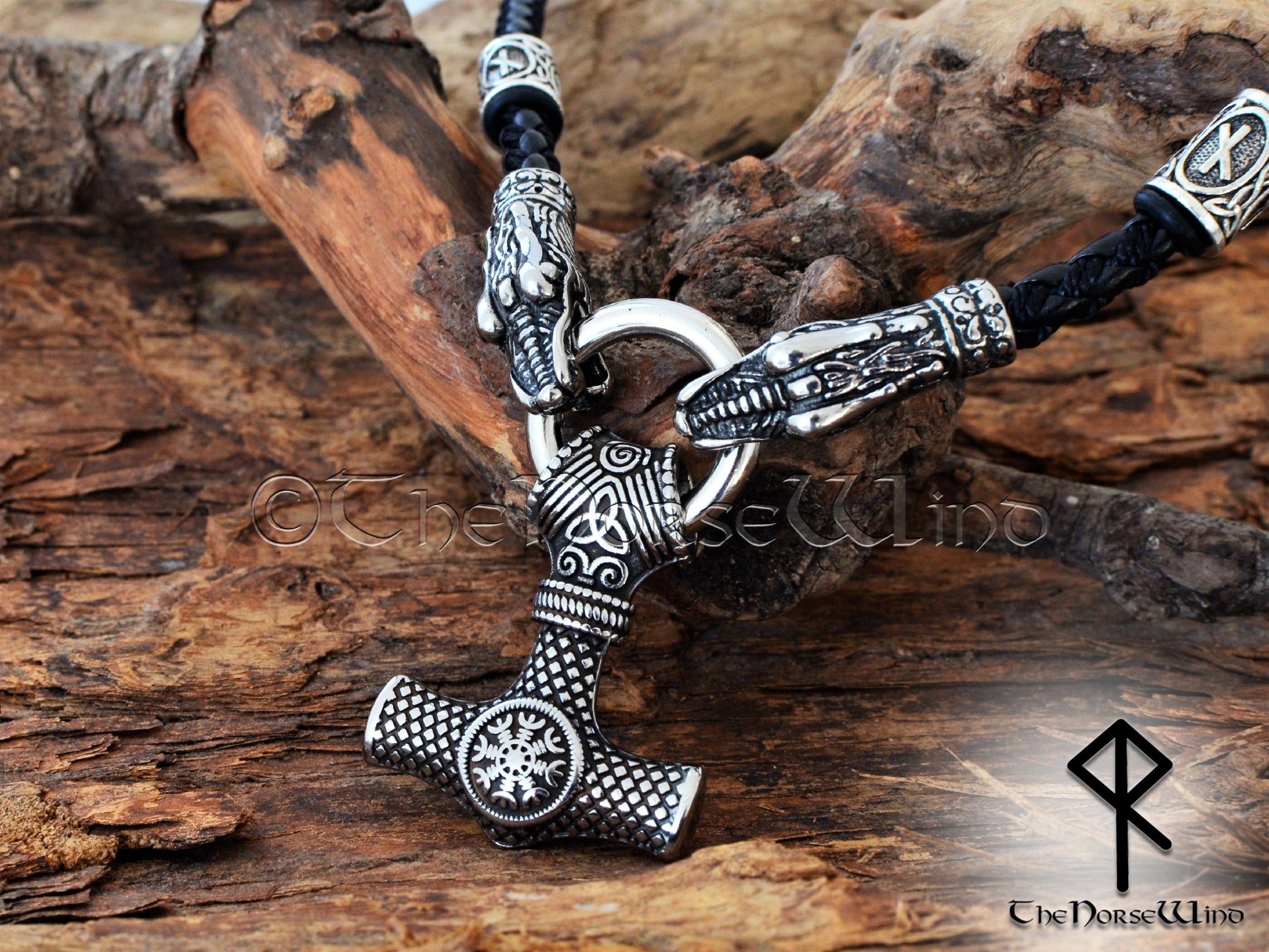 Thor's Hammer O-ring Necklace, Helm of Awe Mjolnir Pendant with Dragon Heads