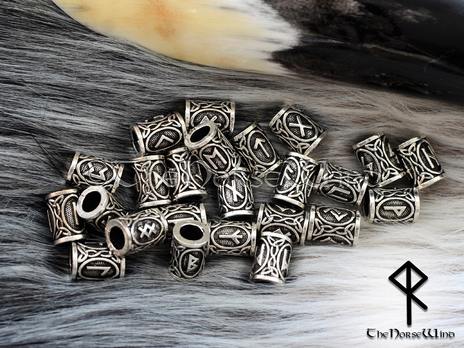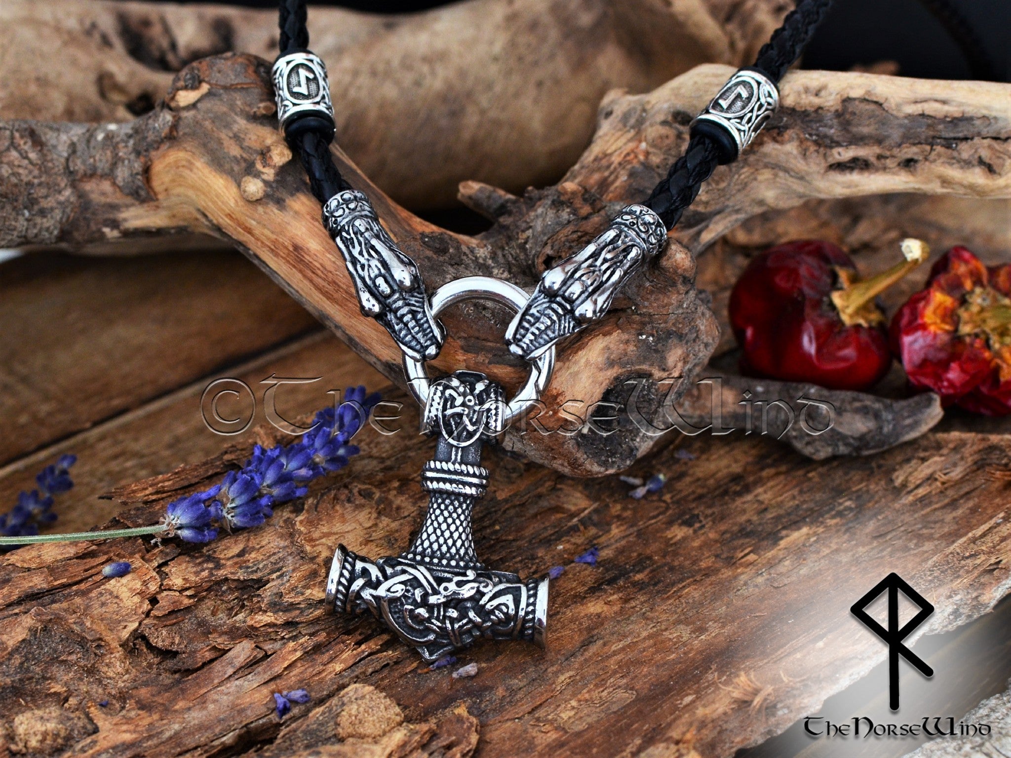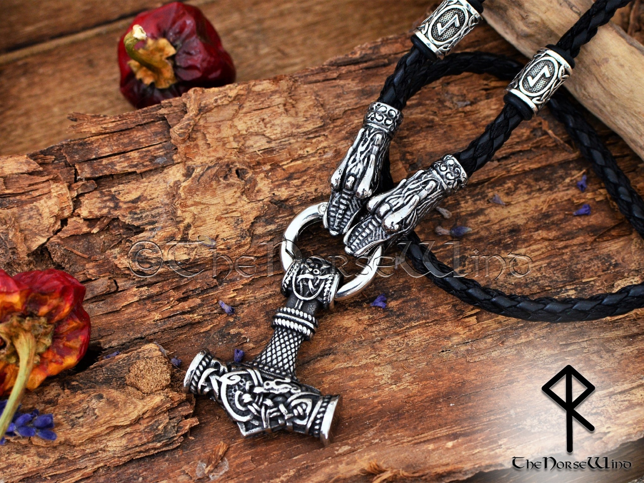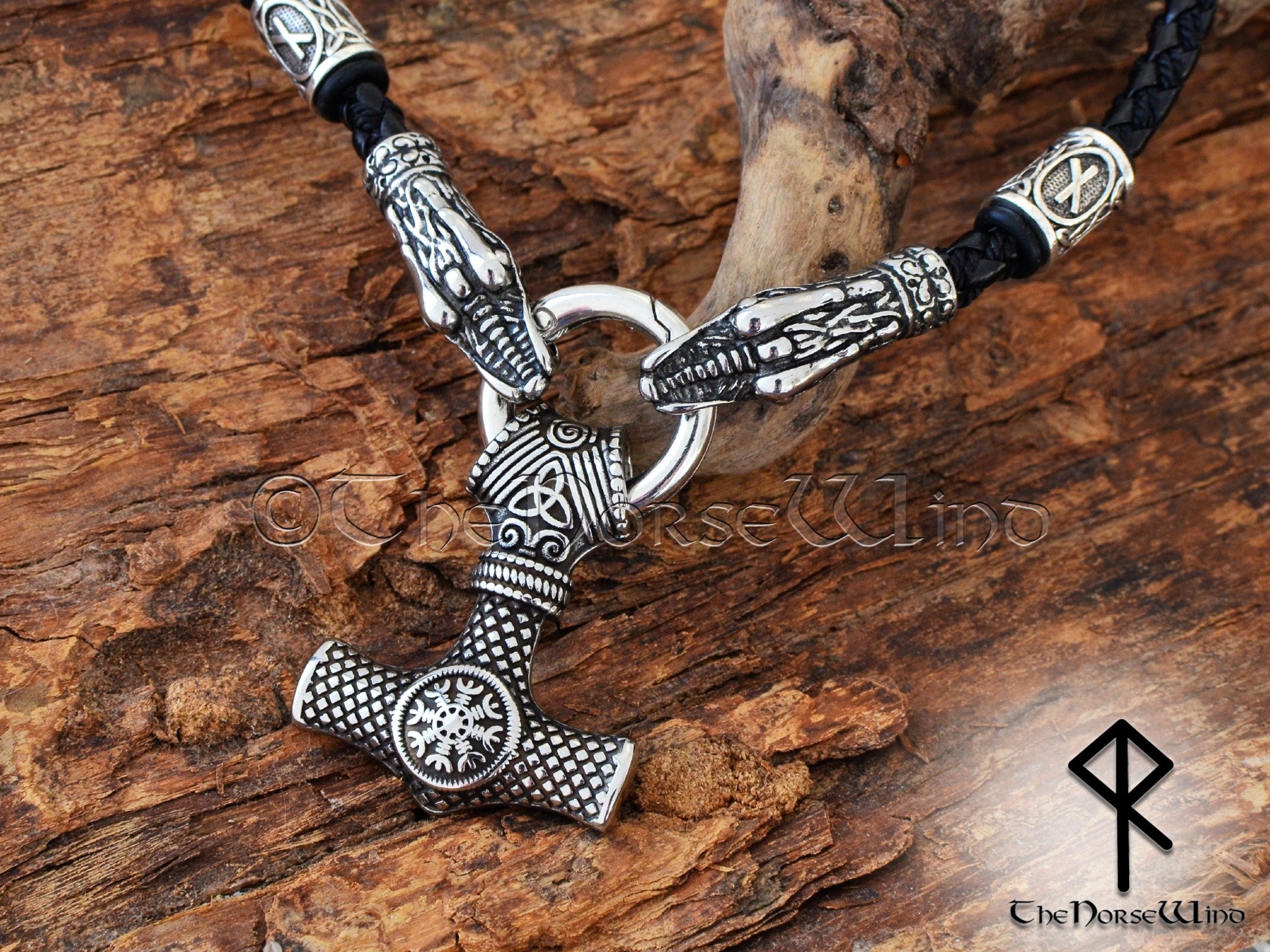 Personalized Viking Thor’s Hammer Necklace – Mjolnir Pendant with Wolf Heads & Rune Beads