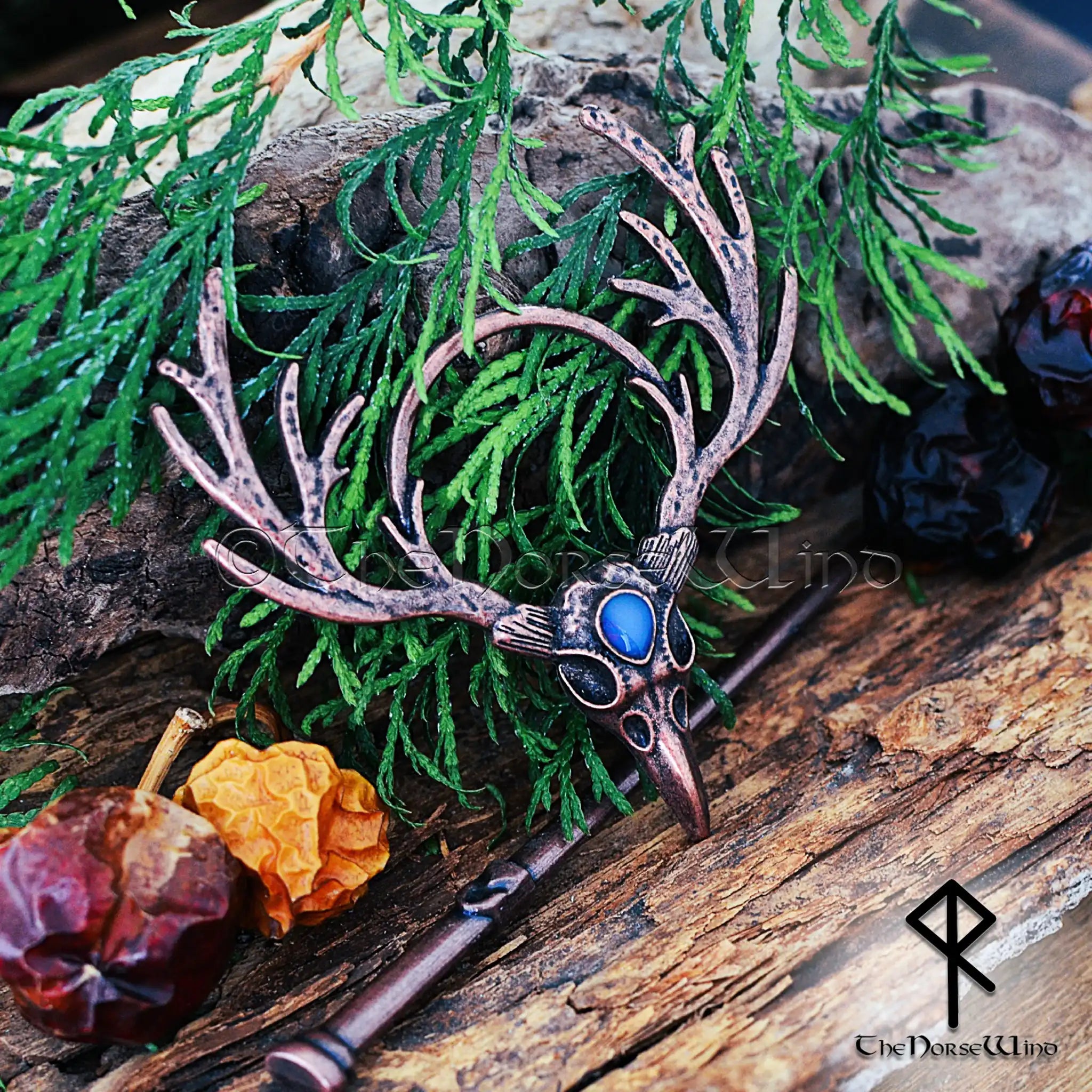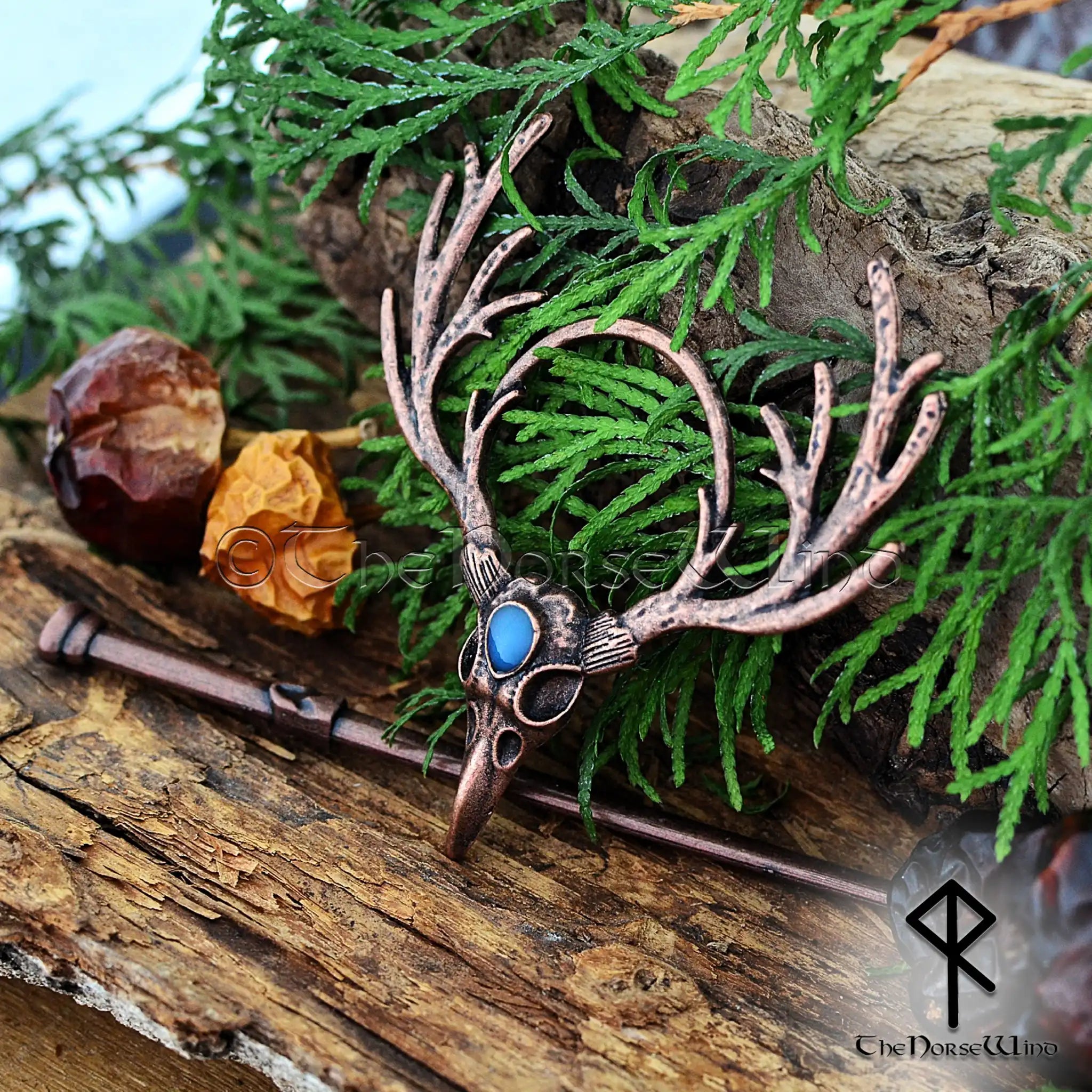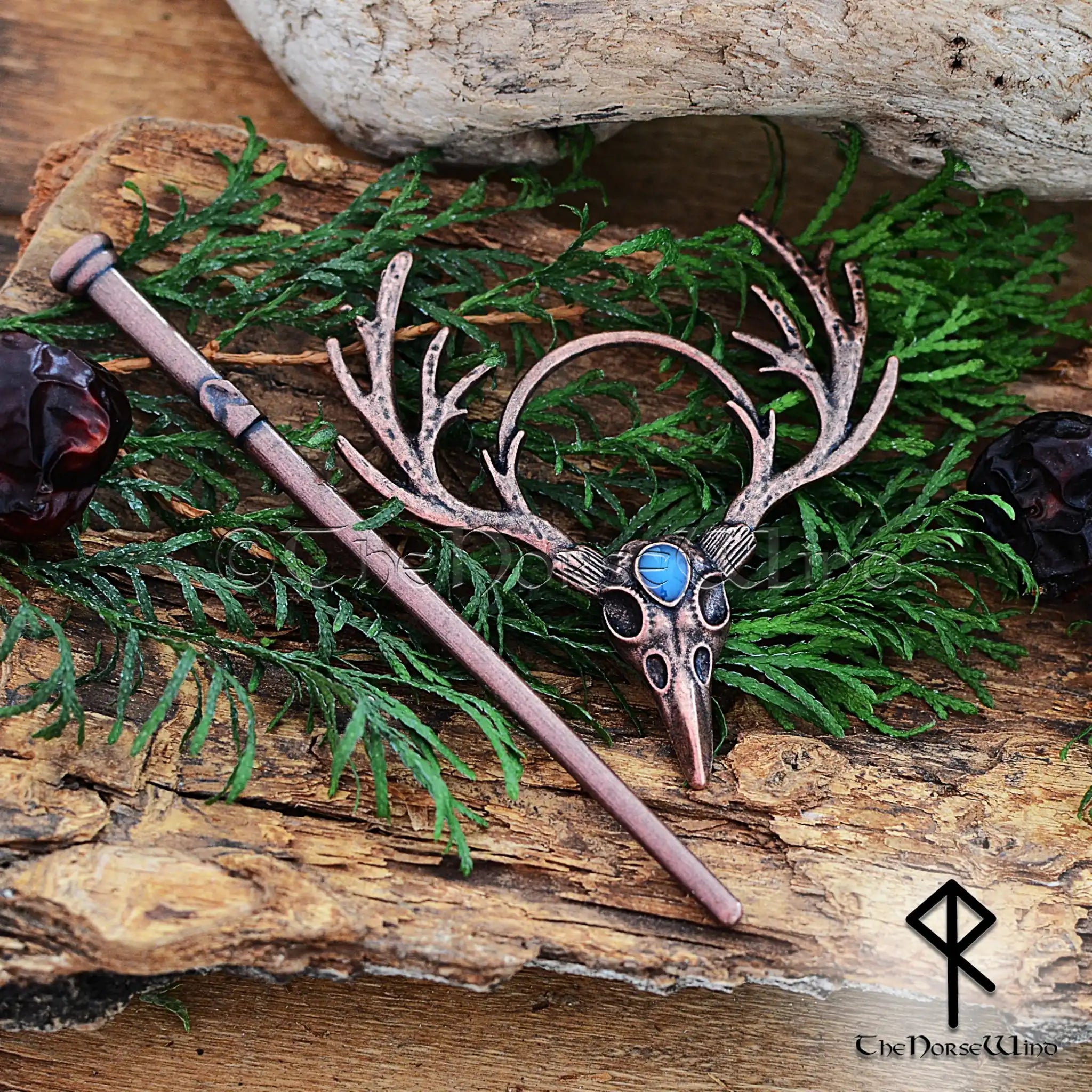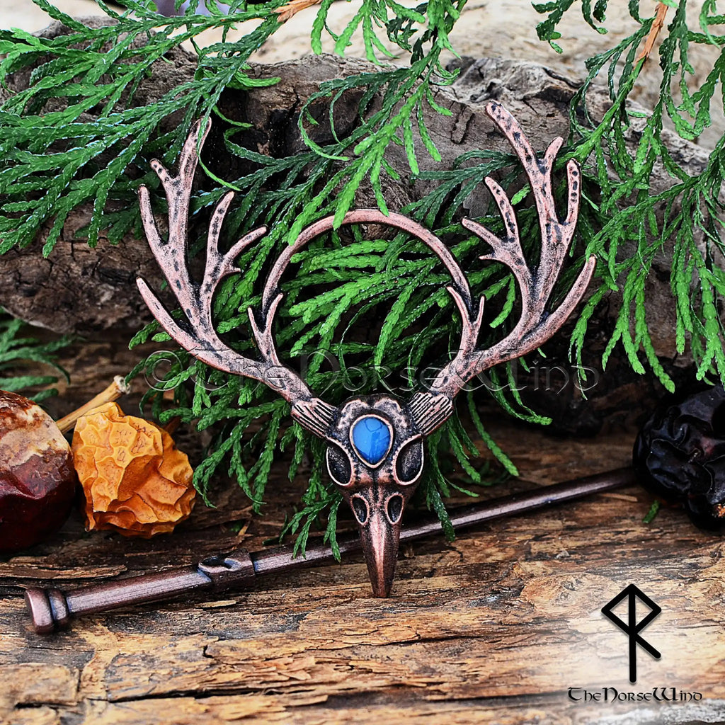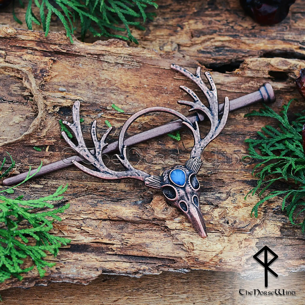 Diese atemberaubende Haarnadel in Form eines Hirschschädels aus tibetischem Silber mit edlem Kupferfinish ist mit einem kunstvollen Geweih und einem leuchtenden Mondstein verziert und symbolisiert die Verbindung zwischen Natur, Göttern und dem himmlischen Reich . Das kunstvolle, handgefertigte Design macht sie zu einem kraftvollen nordischen und heidnischen Haaraccessoire für moderne Schildmaiden, Jägerinnen und Liebhaber der Wikingergeschichte.