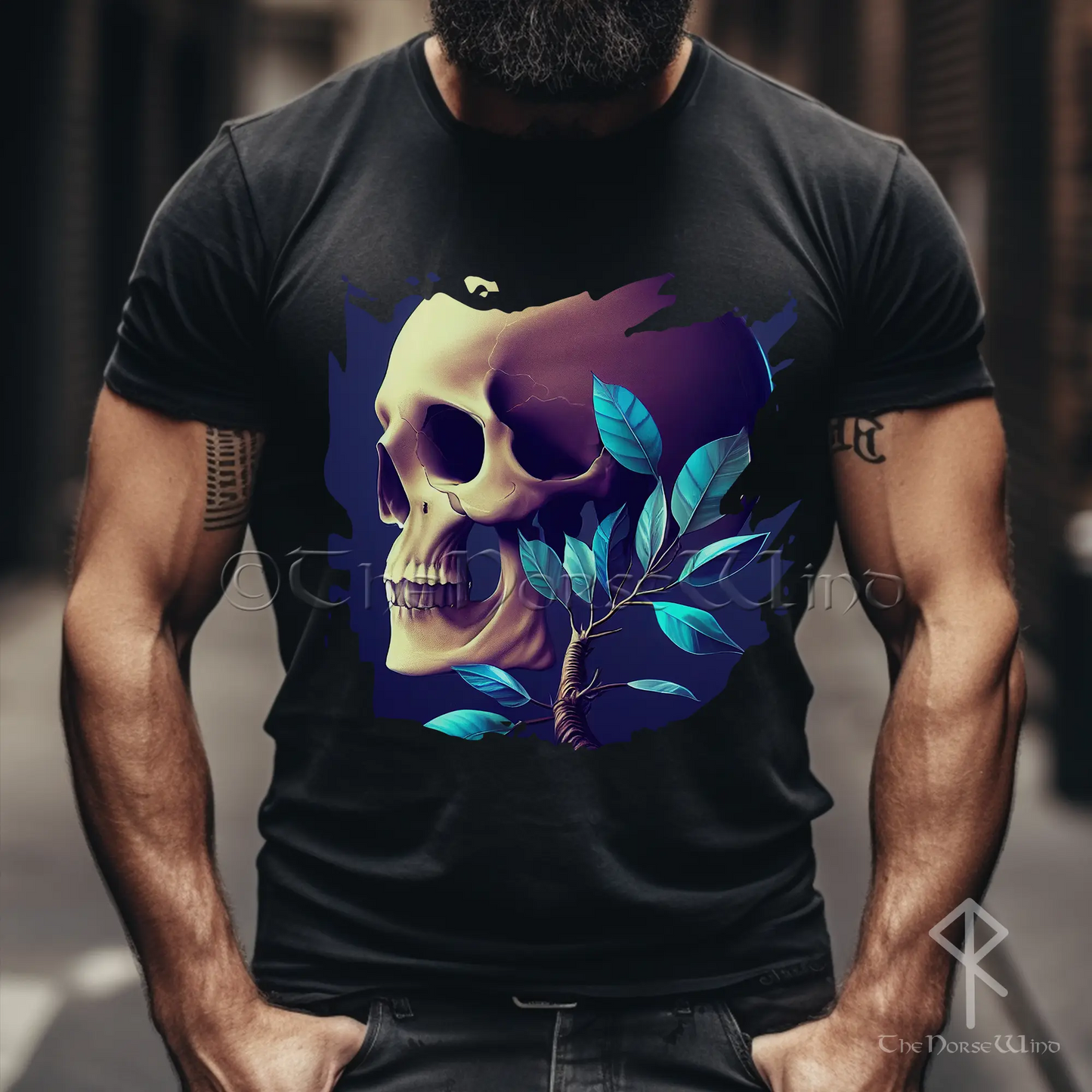 Lassen Sie sich von der dunklen Faszination unseres Gothic Skull T-Shirts verführen – einem alternativen Meisterwerk mit einem unvergesslich schönen Totenkopf mit verschlungenen Ästen in leuchtenden Lilatönen.