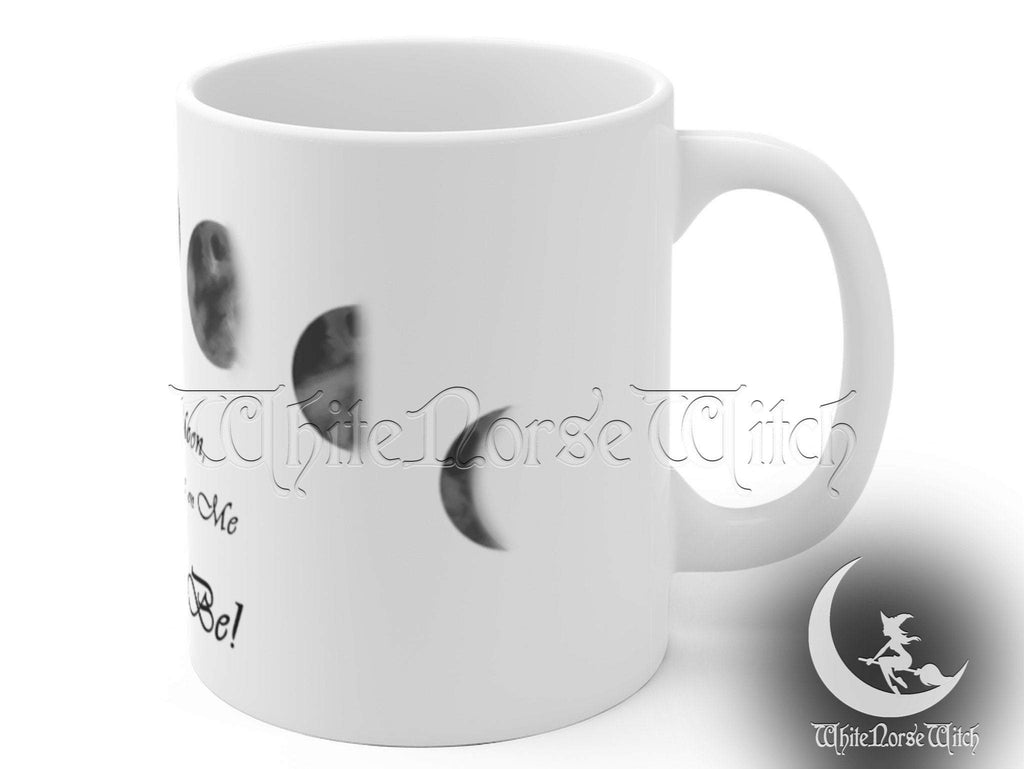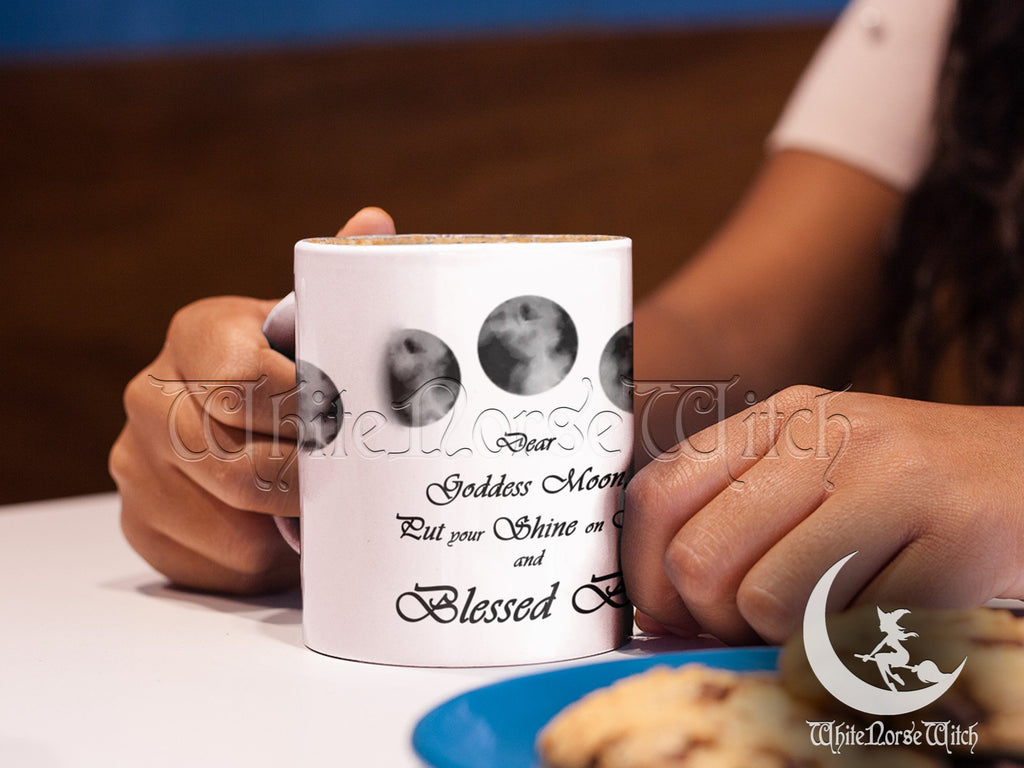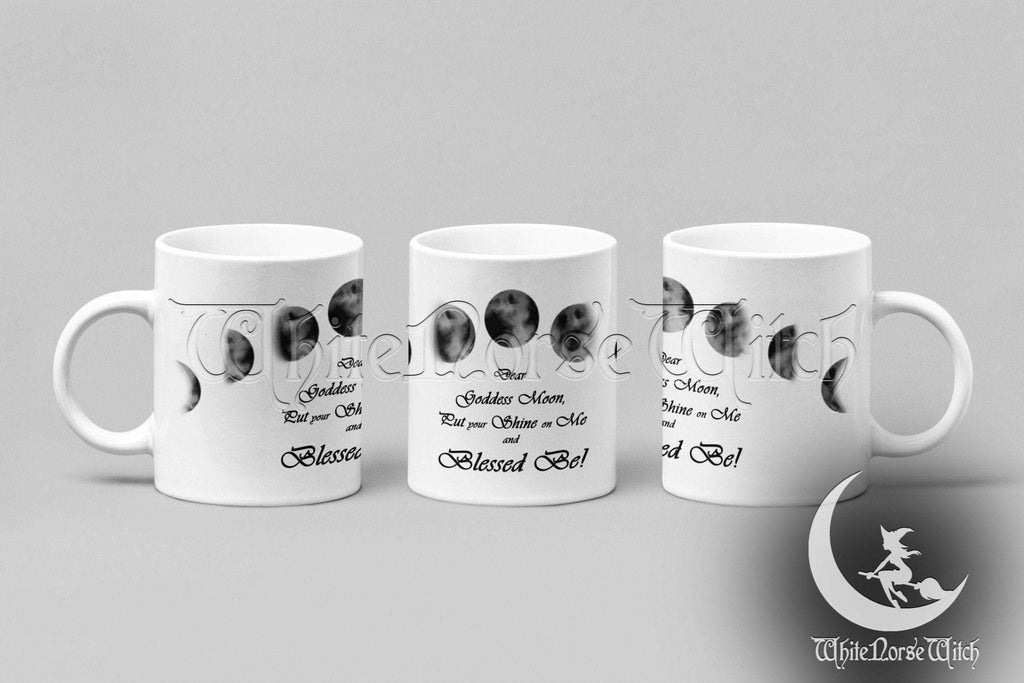 Einzigartige weiße Tasse mit Mondphasen und Gebetssegen der Mondgöttin. Füllen Sie es mit Tee, Kaffee oder Tränken oder dekorieren Sie Ihren Altar. Wenn Sie auf der Suche nach einem Geschenk für Ihre Hexenfreundin sind, wird sie oder er diese Tasse bestimmt lieben!