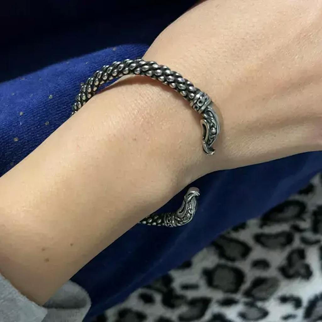 Lassen Sie den mächtigen Geist von Nidhogg , dem Drachen aus der nordischen Mythologie, mit diesem auffälligen, aufwendig gearbeiteten Torque-Armband in sich aufsteigen. Inspiriert von der TV-Serie „Vikings“ ähnelt dieser Armreif dem von Athelstan getragenen Armband und symbolisiert seine Verbindung zur nordischen Kultur und die Stärke der Wikingerkrieger.