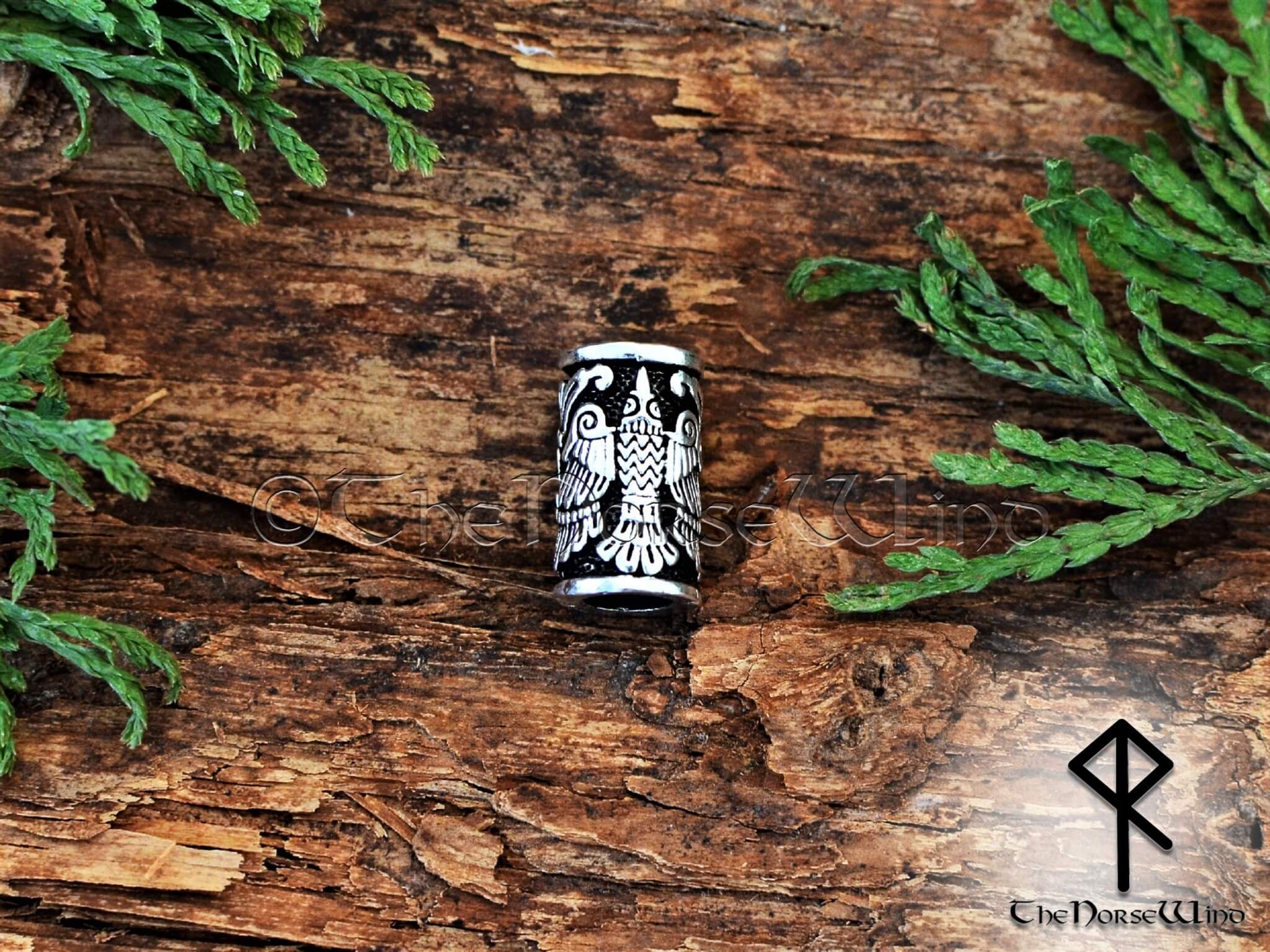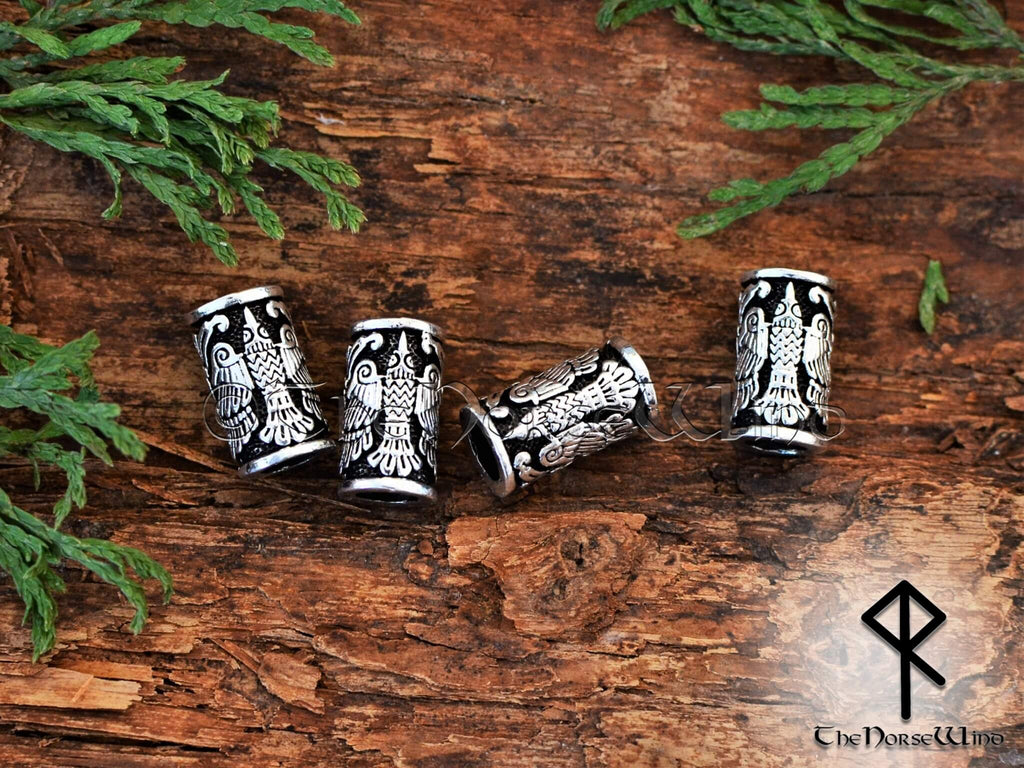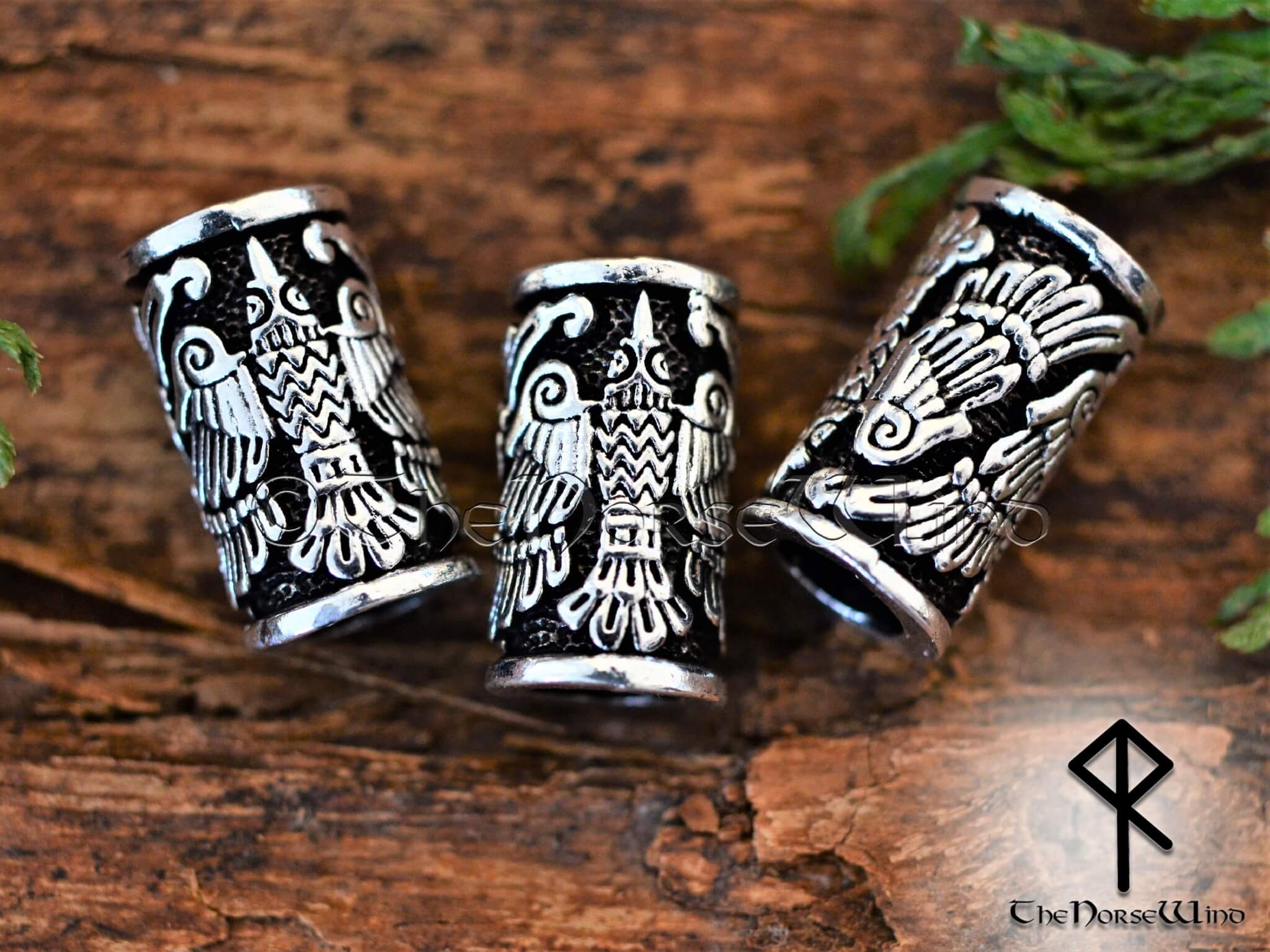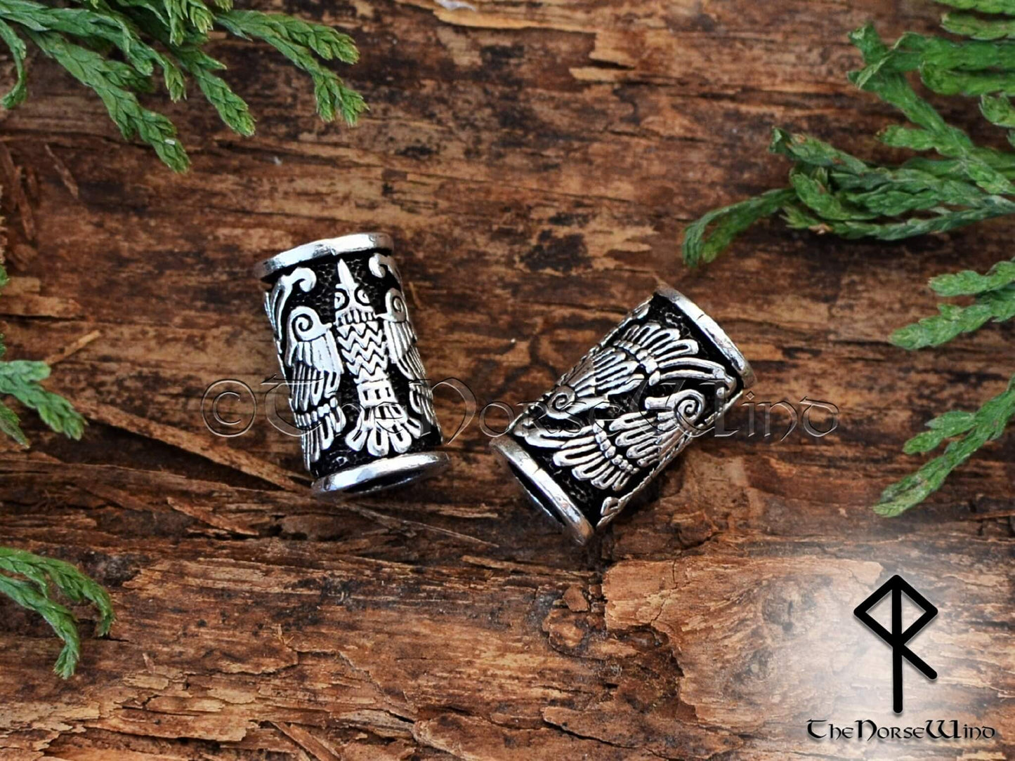 Jede Bartperle zeigt stolz Odins Raben Huginn und Muninn, die Gedanken und Erinnerungen symbolisieren. Diese intelligenten Vögel dienten als Odins Boten und wurden für ihre Weisheit und Einsicht verehrt.