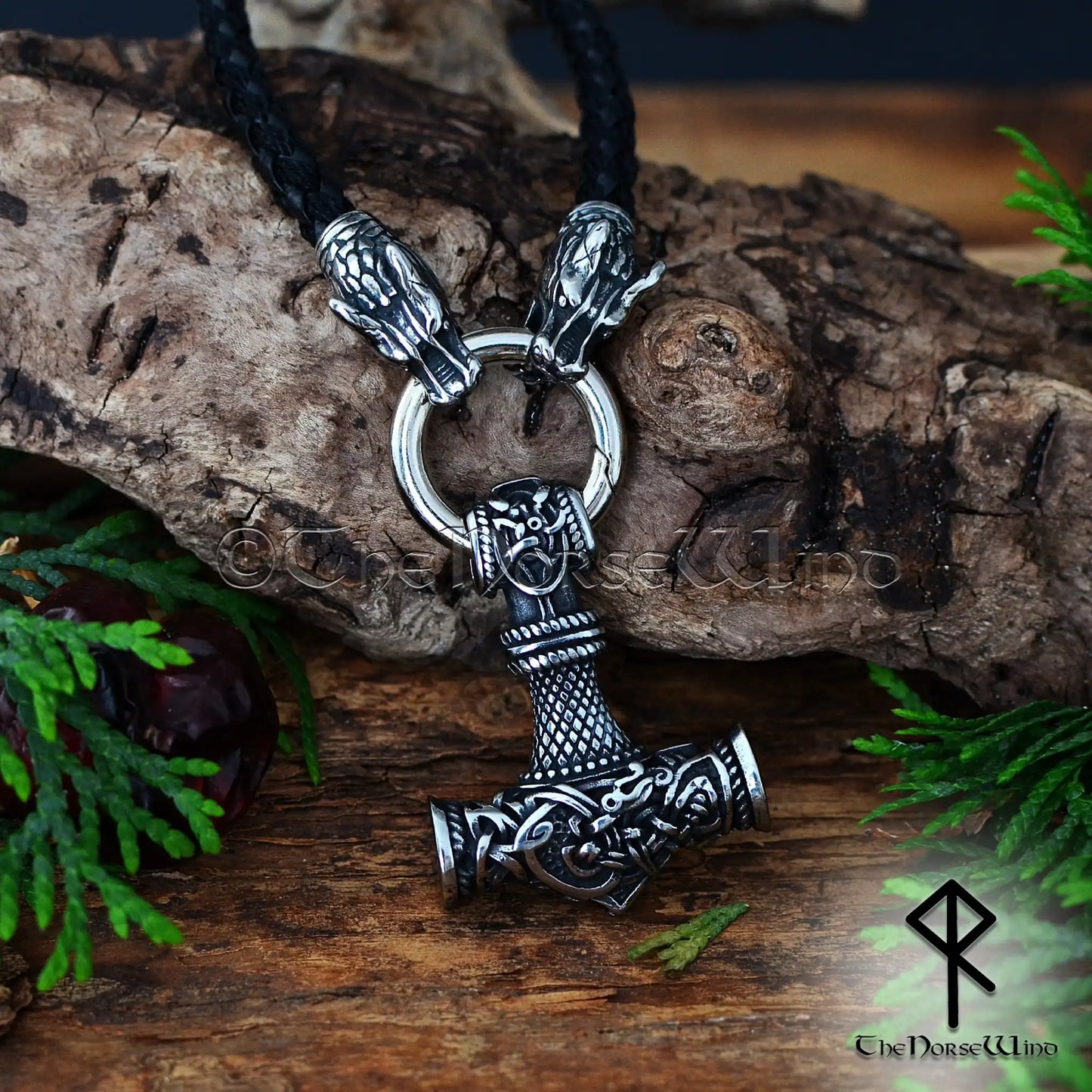 Das Herzstück ist ein massiver, doppelseitiger Mjolnir-Anhänger, der fachmännisch gegossen und mit dem mythischen Nidhogg-Drachen für unvergleichliche Details und Symbolik aufwendig graviert wurde. Zusammen mit einem strapazierfähigen geflochtenen Lederband und hypoallergenen Wolfsköpfen aus Edelstahl sorgt diese Halskette für Komfort, Haltbarkeit und zeitlose Attraktivität. Ein Messing-O-Ring verbindet die Elemente und verleiht dem robusten Design einen Hauch von Eleganz.