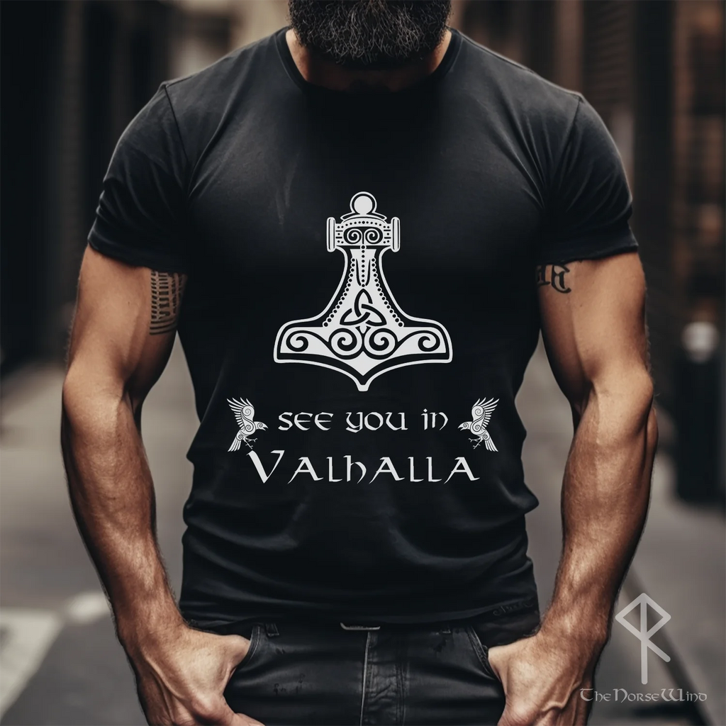Rüste dich mit der Kraft von Mjolnir und dem Geist eines Wikingerkriegers aus. Lass das Sprichwort „Wir sehen uns in Walhalla“ in deinem Herzen widerhallen, während du ein T-Shirt trägst, das die Kraft und Ehre der nordischen Mythologie verkörpert.