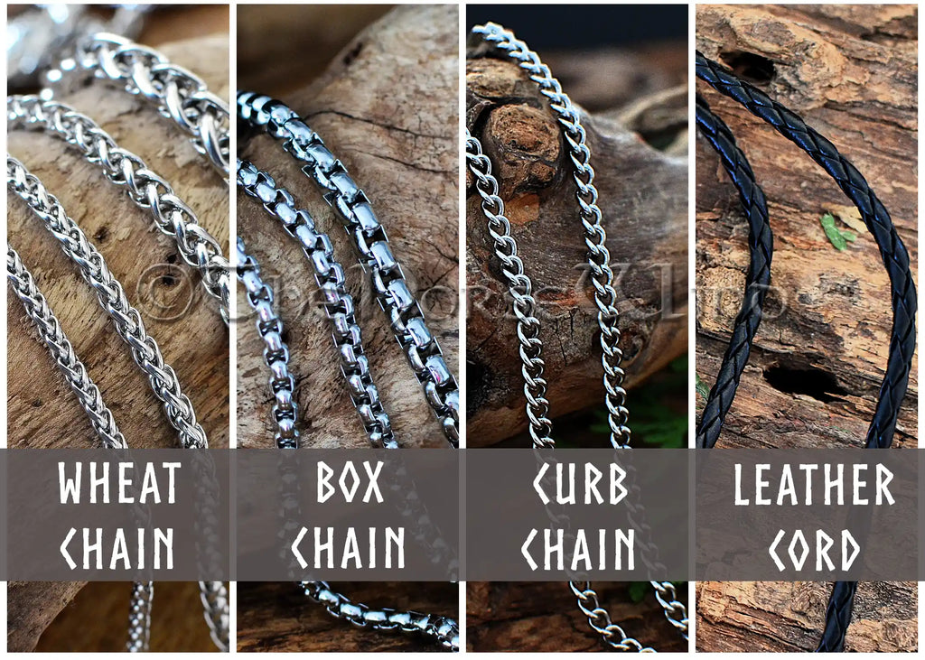 Der Anhänger aus hochwertigem 316L-Edelstahl misst 4,2 cm x 3,2 cm bzw. 4,8 cm mit Aufhänger . Jede Halskette wird mit vielseitigen Kettenoptionen angeboten: Weizenkette, Panzerkette, Panzerkette oder geflochtenes Lederband . Dieses Stück ist mehr als nur Schmuck – es ist eine Verbindung zur Wikingerzeit und eine Hommage an das nordische Erbe.