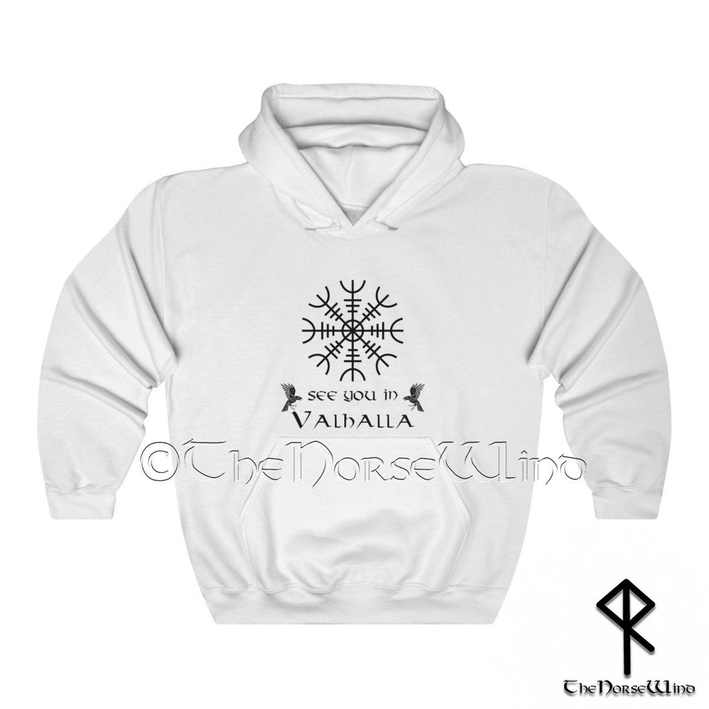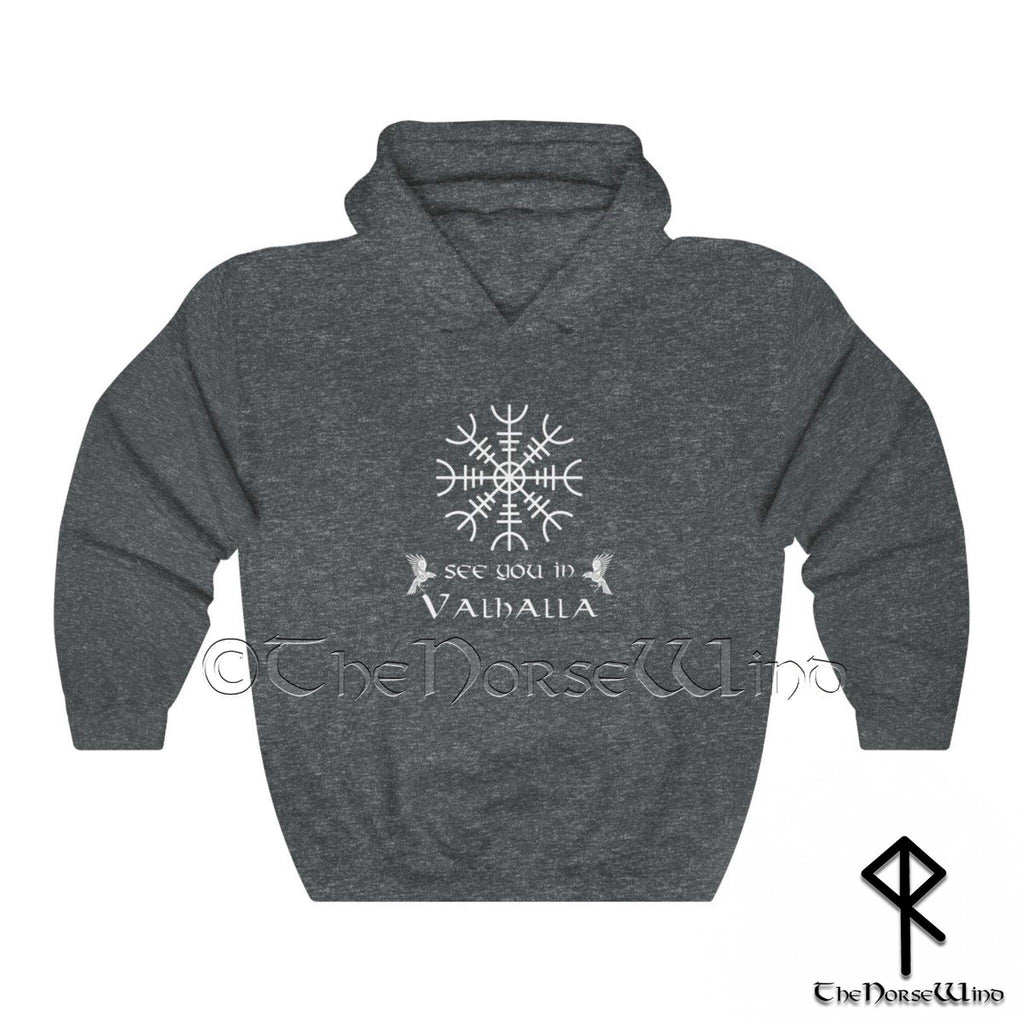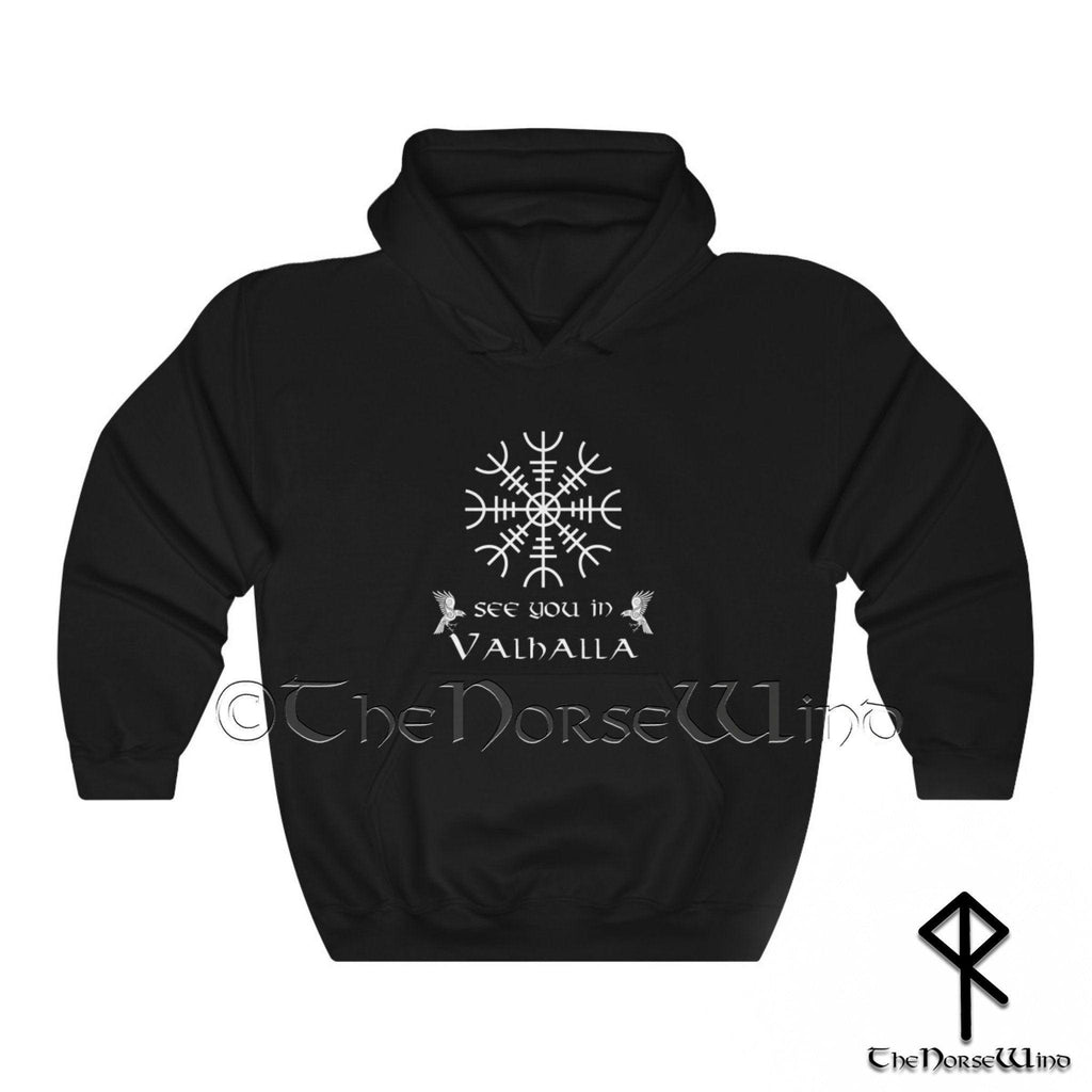 Hüllen Sie sich in die Essenz der Wikinger-Tapferkeit mit unserem Wikinger-Kapuzenpullover - Helm of Awe Aegishjalmur Runes Sweatshirt, einer tiefgründigen Hommage an das nordische Erbe. Dieser Unisex-Kapuzenpullover verbindet nahtlos Stil mit tiefer Symbolik und zeigt das Helm of Awe Aegishjalmur-Symbol und mächtige Runeninschriften, während er gleichzeitig Mitkrieger mit der Aussage „Wir sehen uns in Walhalla“ einlädt.