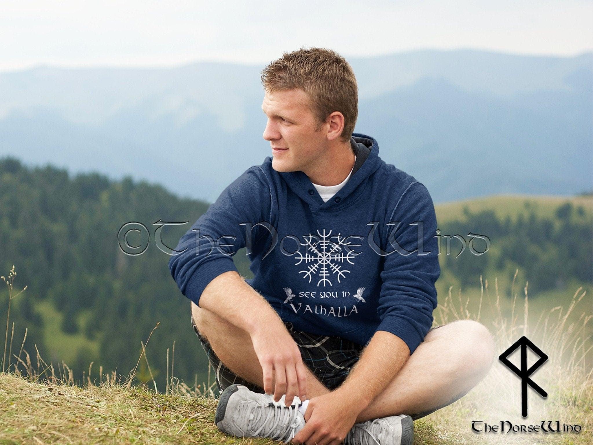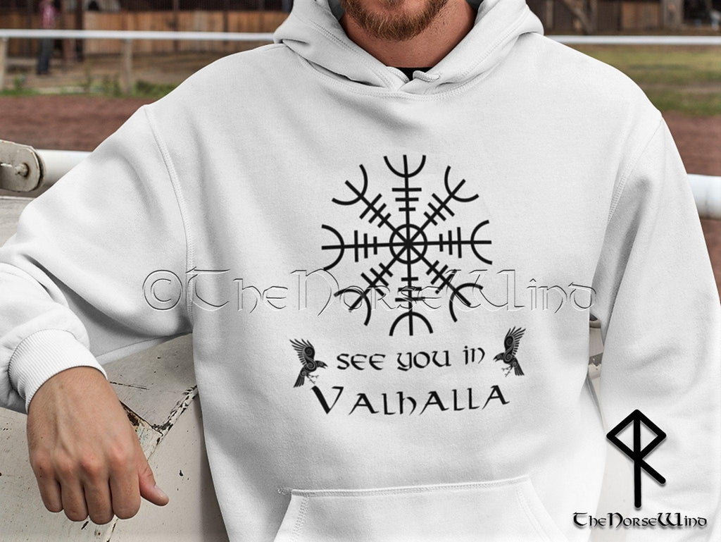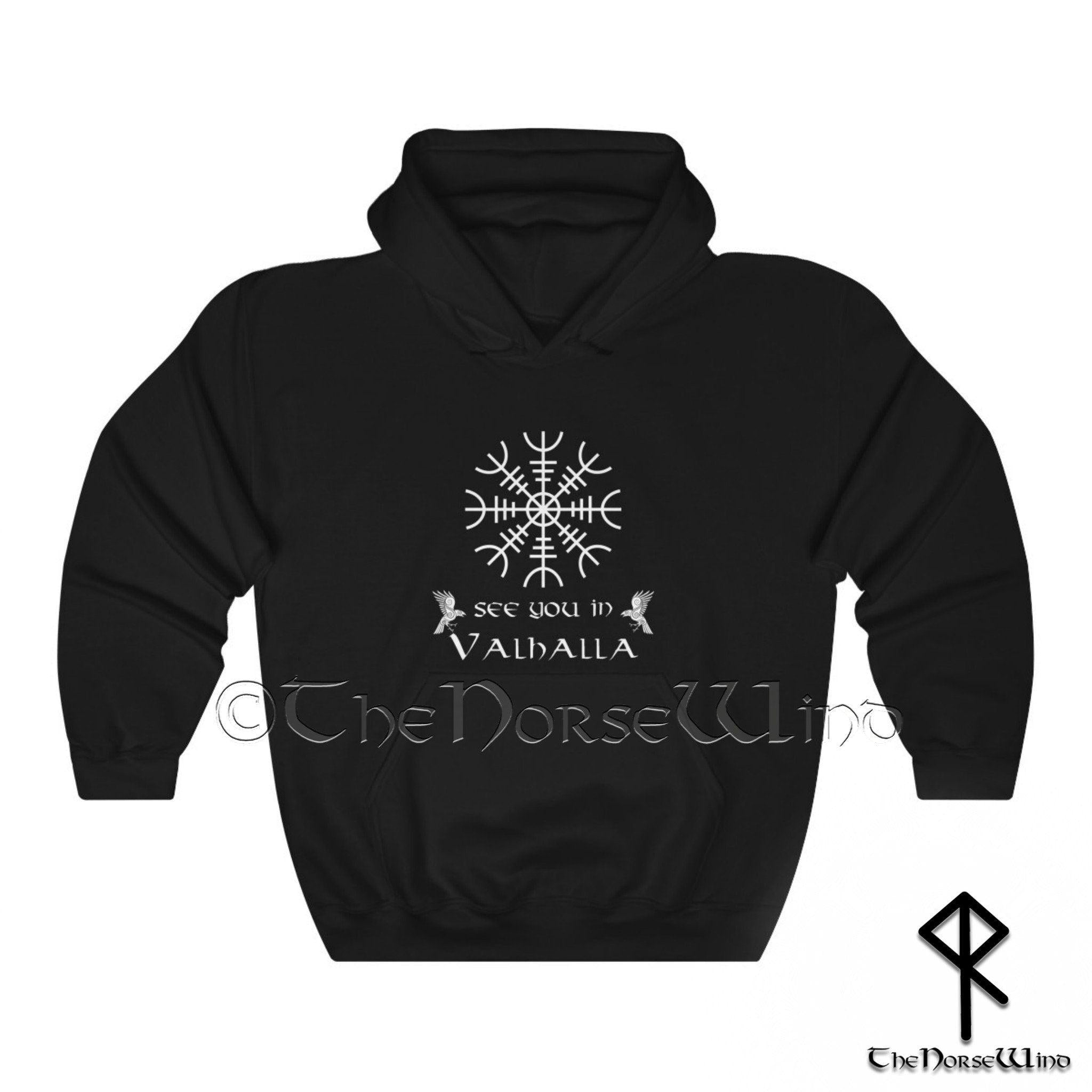 Hüllen Sie sich in die Essenz der Wikinger-Tapferkeit mit unserem Wikinger-Kapuzenpullover - Helm of Awe Aegishjalmur Runes Sweatshirt, einer tiefgründigen Hommage an das nordische Erbe. Dieser Unisex-Kapuzenpullover verbindet nahtlos Stil mit tiefer Symbolik und zeigt das Helm of Awe Aegishjalmur-Symbol und mächtige Runeninschriften, während er gleichzeitig Mitkrieger mit der Aussage „Wir sehen uns in Walhalla“ einlädt.