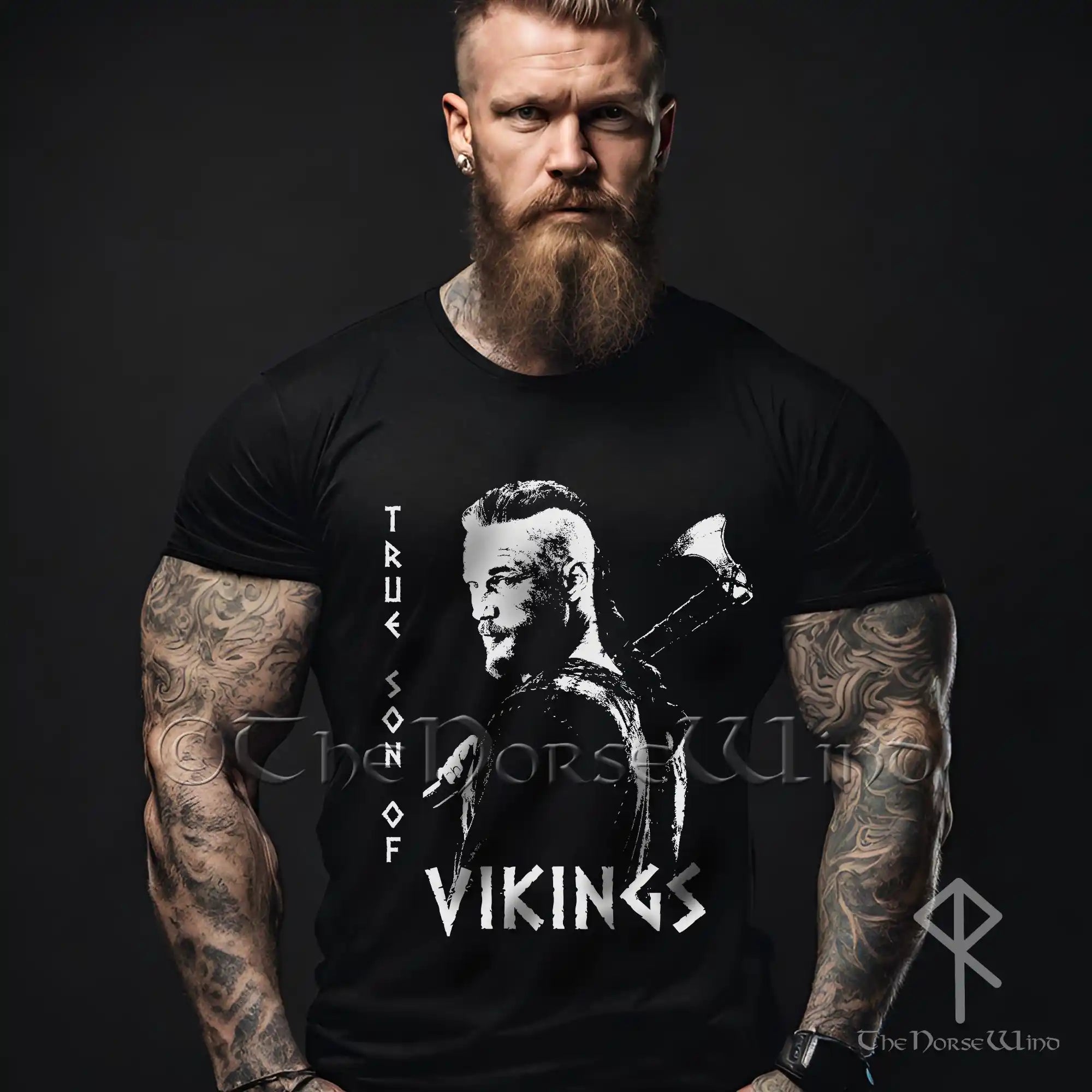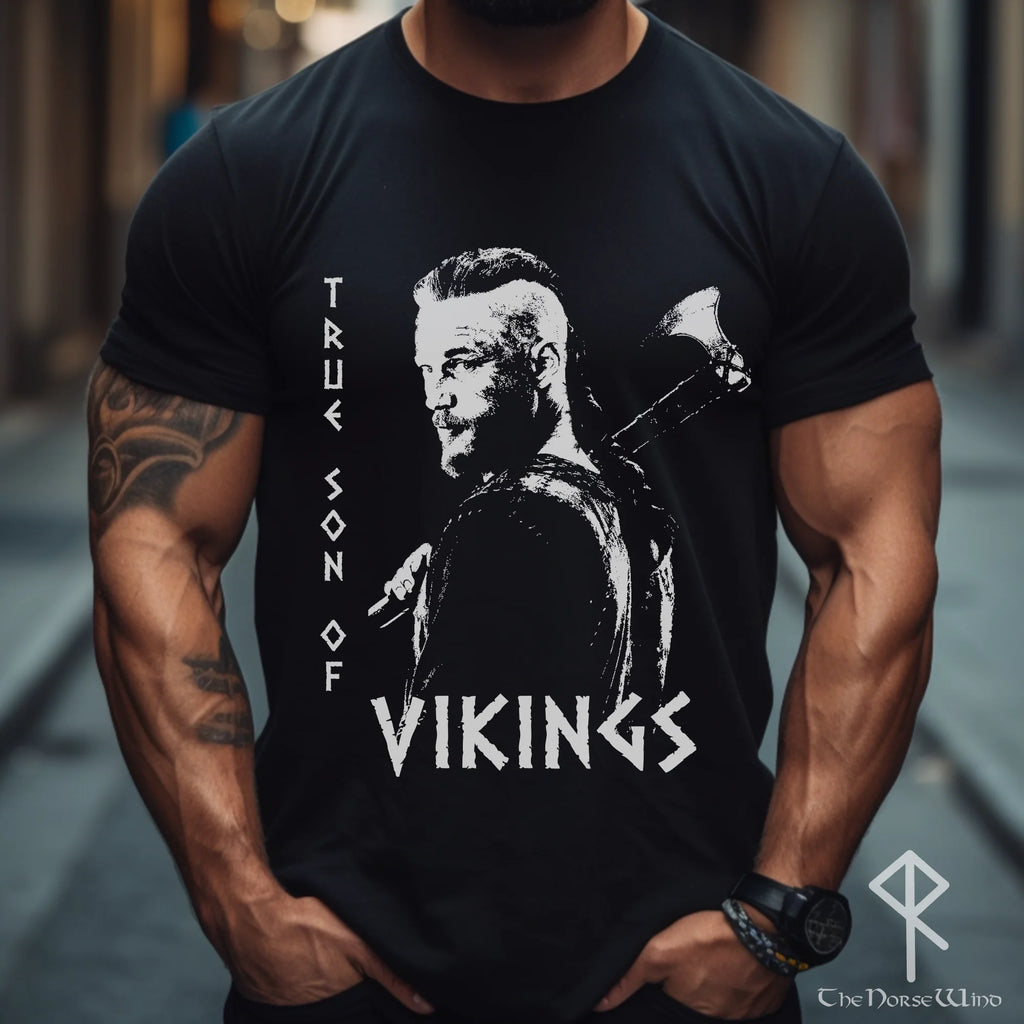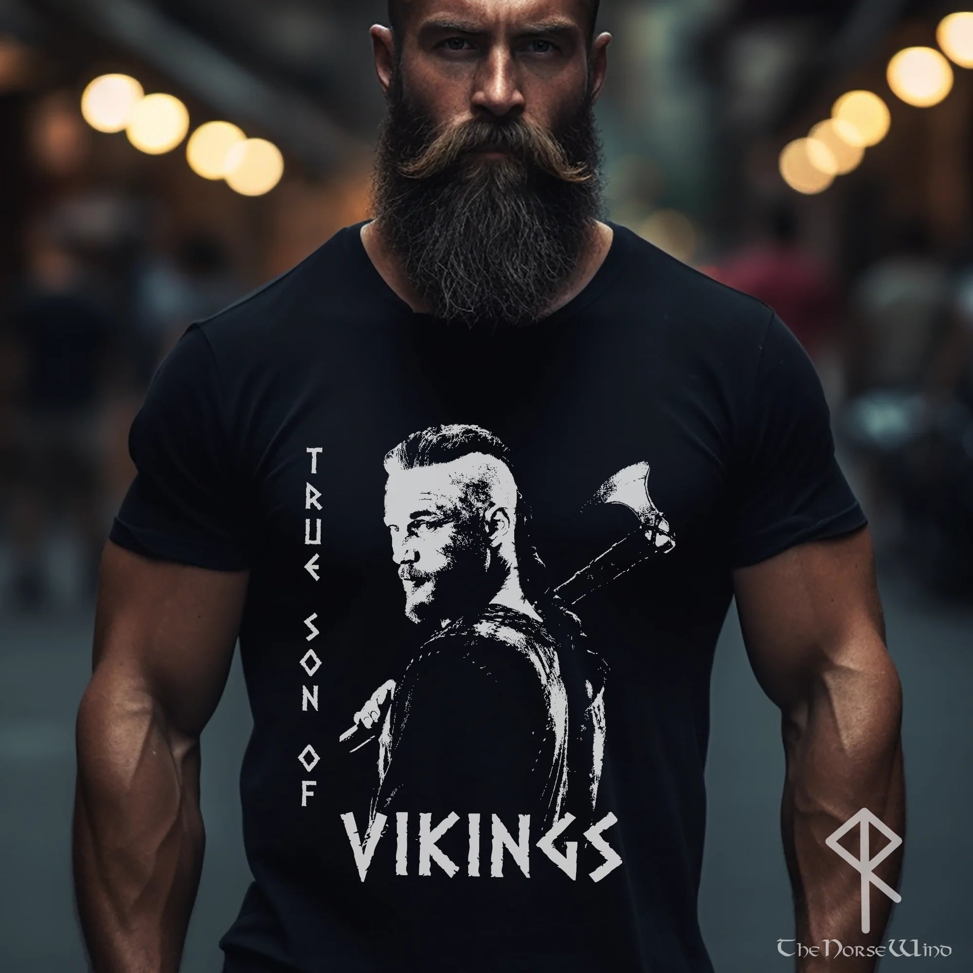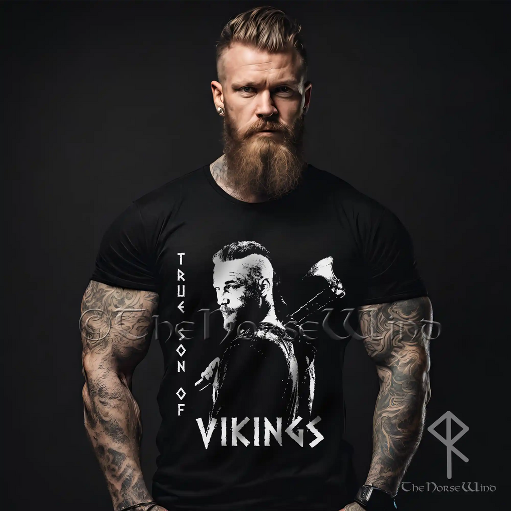 Wikinger-T-Shirt, True Son of Vikings Ragnar Lothbrok Axt-T-Shirt, schwarzes Biker-T-Shirt
