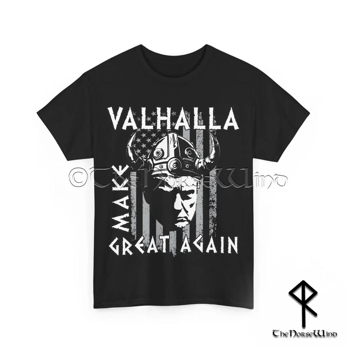 Zeigen Sie Ihren Wikingergeist mit unserem Trump-T-Shirt „Make Valhalla Great Again“! Dieses einzigartige Design verbindet nordische Mythologie mit moderner Satire und zeigt Donald Trump als wilden nordischen Krieger.