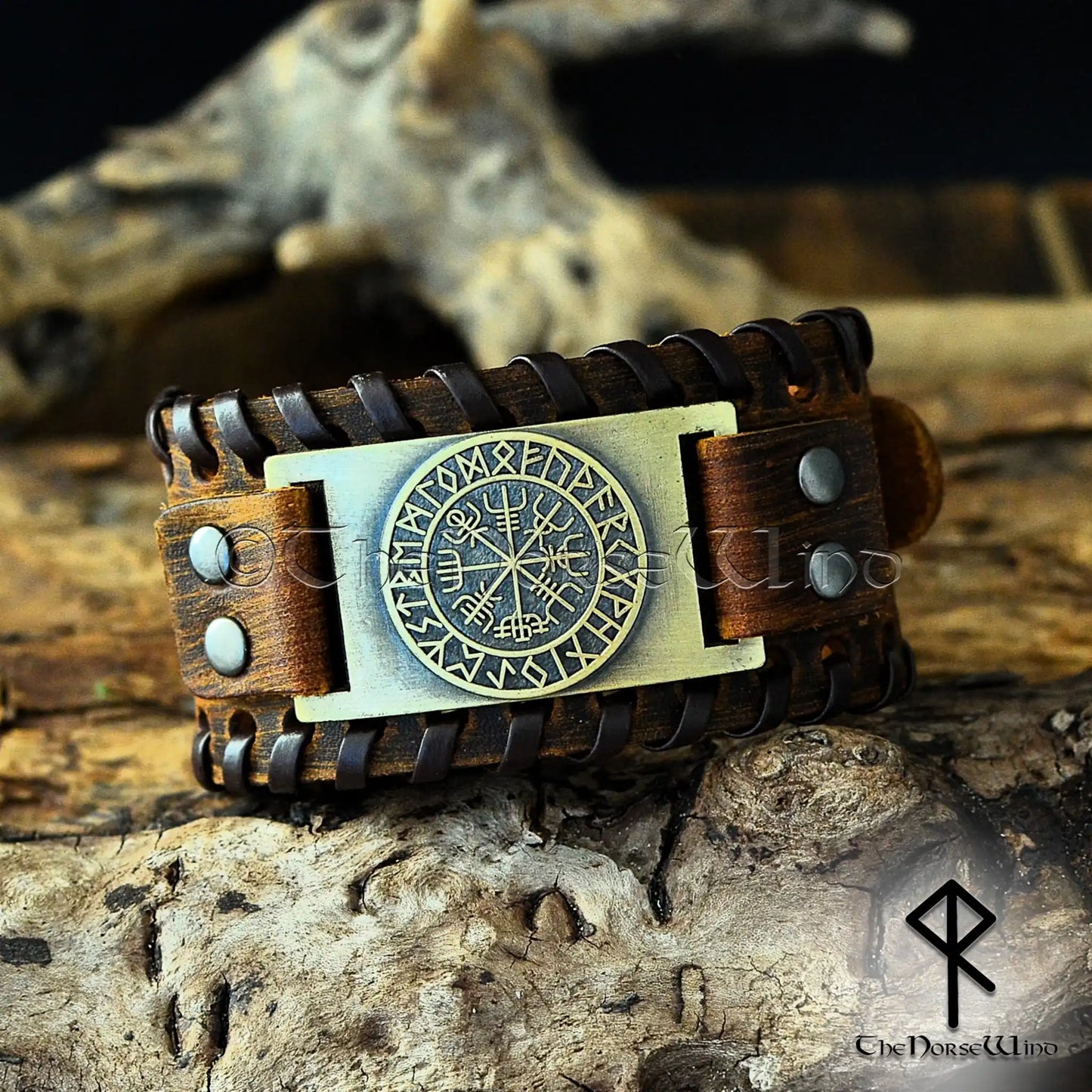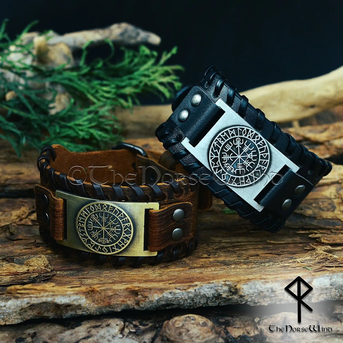 Diese handgefertigten Armbänder aus hochwertigem Leder bieten sowohl Haltbarkeit als auch Komfort. Die kontrastierenden Metalle unterstreichen die detaillierte Verarbeitung des Vegvisir-Symbols.