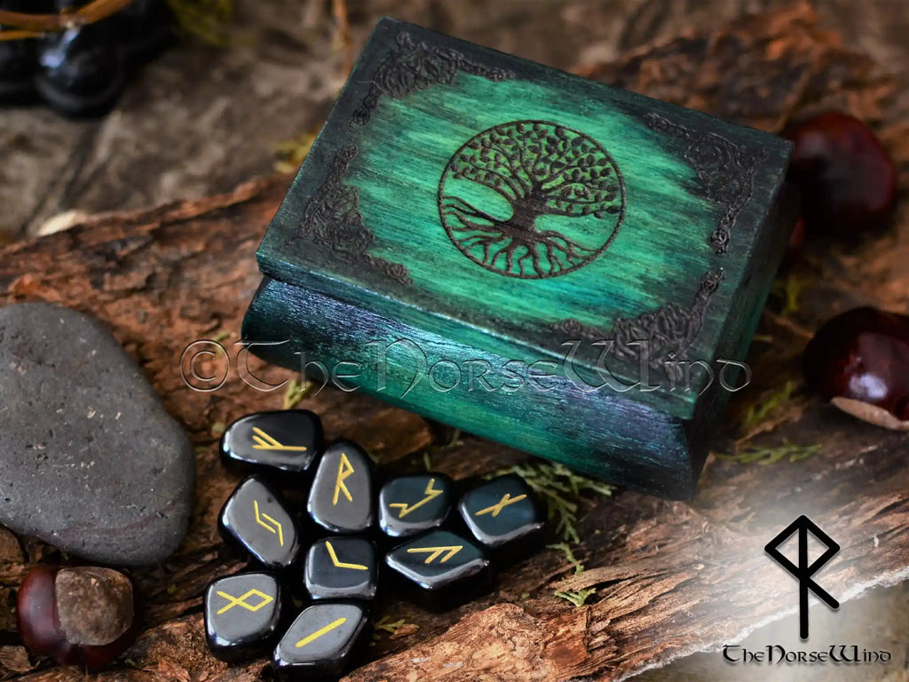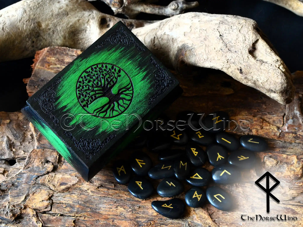 Futhark-Runensteine-Set in grüner Yggdrasil-Holzbox