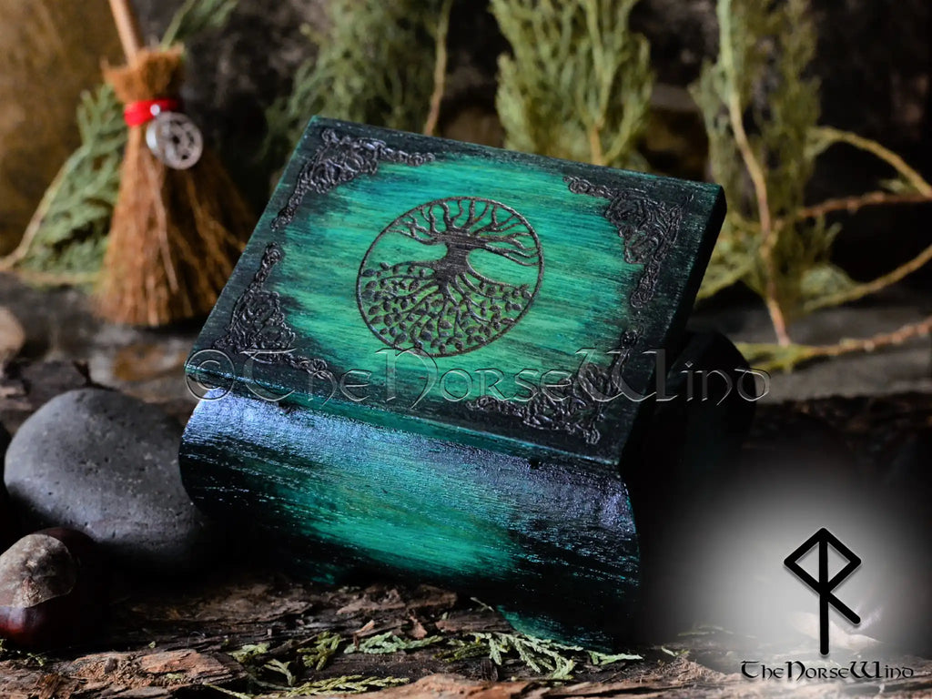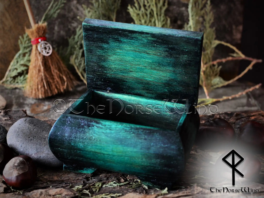 Jede Box wird sorgfältig aus umweltfreundlichen Materialien hergestellt und ist somit eine wirklich einzigartige und umweltbewusste Ergänzung für Ihr Hexenset oder Ihre Wikingerdekoration. Sie können die Box auch einzeln kaufen, perfekt zur Verzierung Ihres Altars oder Schreins.