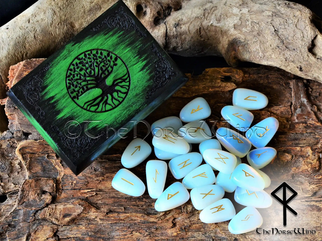 Verbessern Sie Ihre spirituelle Praxis mit dem Yggdrasil-Runenstein-Set, elegant untergebracht in einer leuchtend grünen Holzbox mit dem Lebensbaum. Dieses einzigartige Set enthält die 24 originalen älteren Futhark-Runen sowie eine Blanko-Rune (Odins Rune), beide wunderschön handgefertigt und poliert. Wählen Sie aus vier kraftvollen Kristalloptionen: Hämatit, schwarzer Obsidian, Opalit oder Rosenquarz.