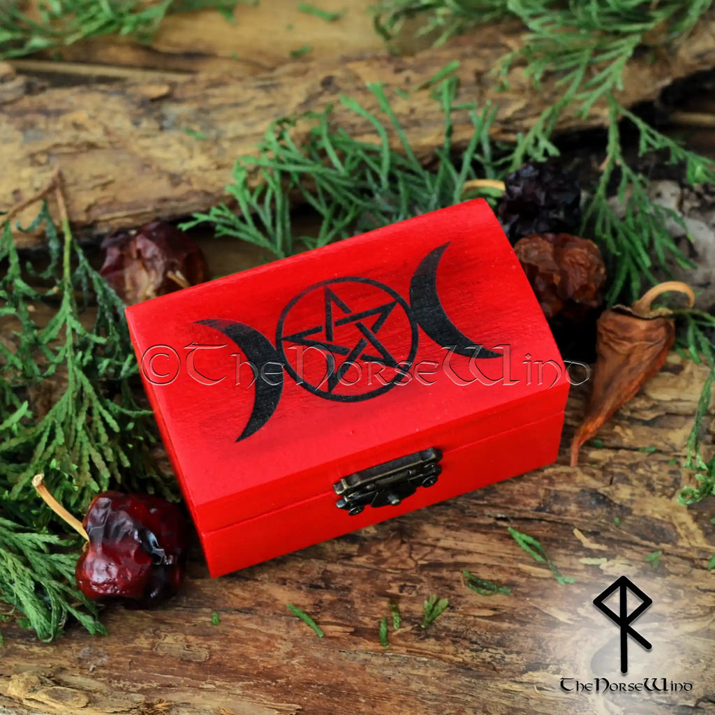 Ergänzt wird das Set durch eine wunderschön gravierte kleine rote Box, die das mächtige Hekate-Pentagramm-Symbol zeigt. Diese süße Minibox mit den Maßen 8,8 cm Länge, 5,5 cm Breite und 4,5 cm Höhe dient als perfekter Aufbewahrungsbehälter und wertet jeden Altar ästhetisch auf.