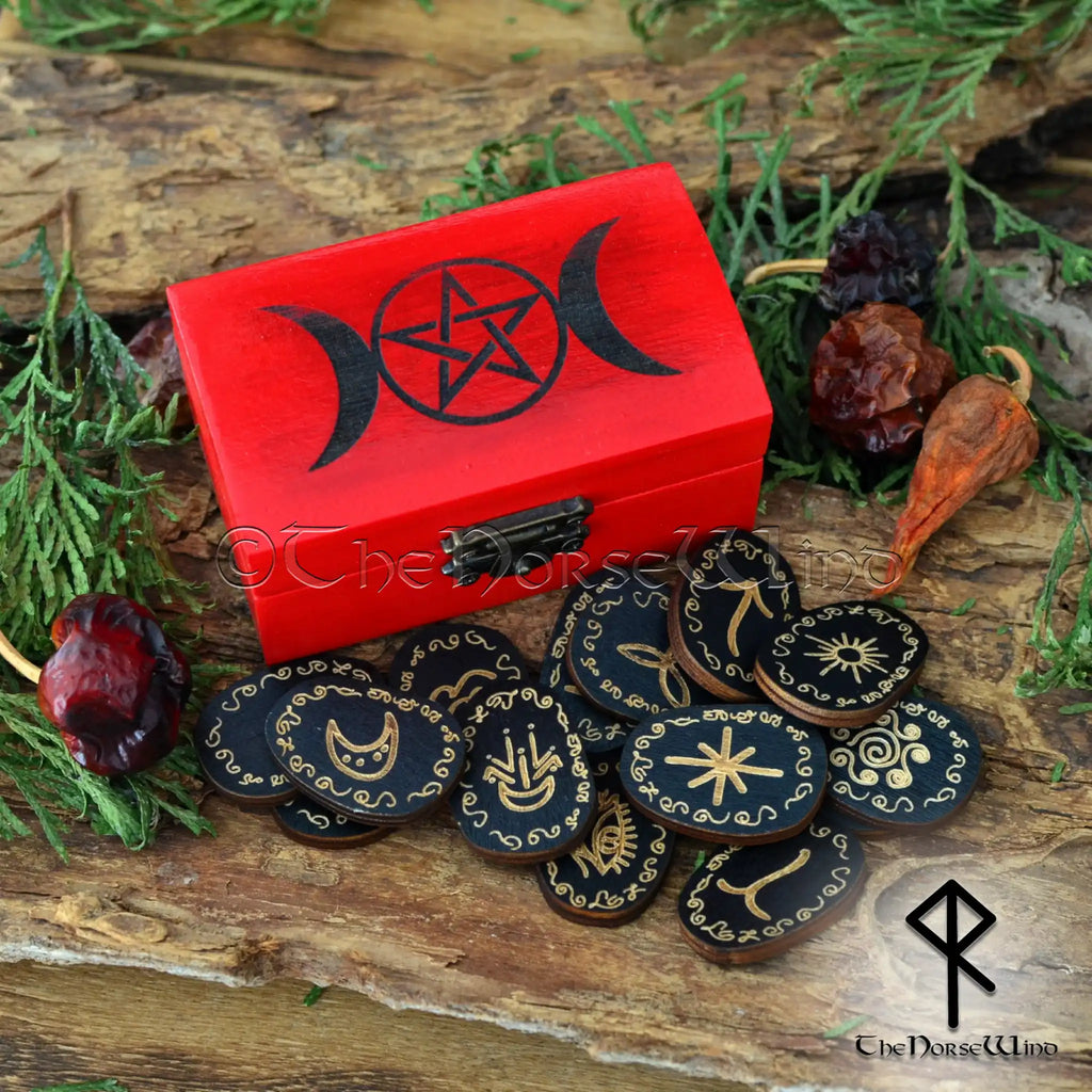 Hexenrunen-Set in Dreifachmond-Pentagramm-Box