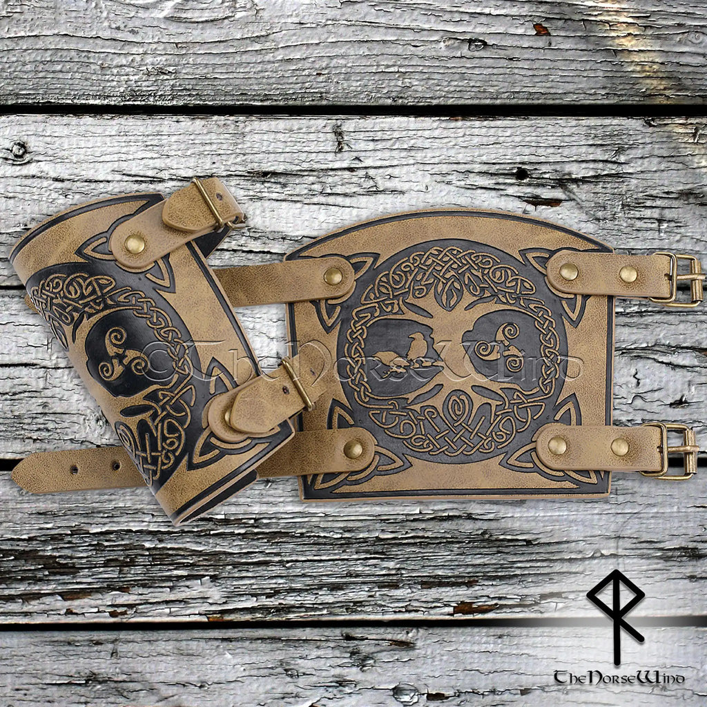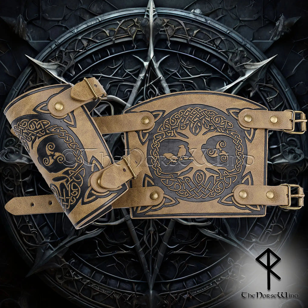 Diese zweiteiligen Lederarmschienen sind mit einem reich geprägten Design verziert, das den Weltenbaum Yggdrasil darstellt, flankiert von Huginn und Muninn , Odins wachsamen Raben. Auf der anderen Seite befindet sich das Triskelion , Symbol für Bewegung, Zyklen und göttliche Energie, umgeben von detailliertem keltischem Knotenmuster , das die ewige Verbindung zwischen den Welten webt.