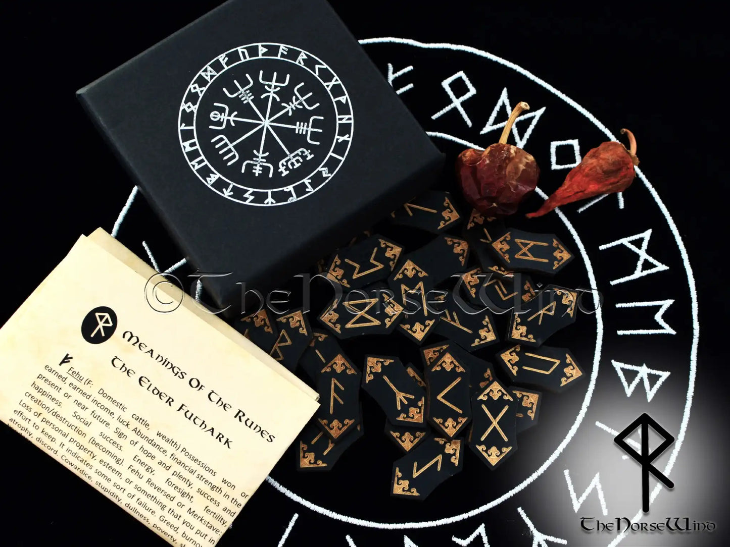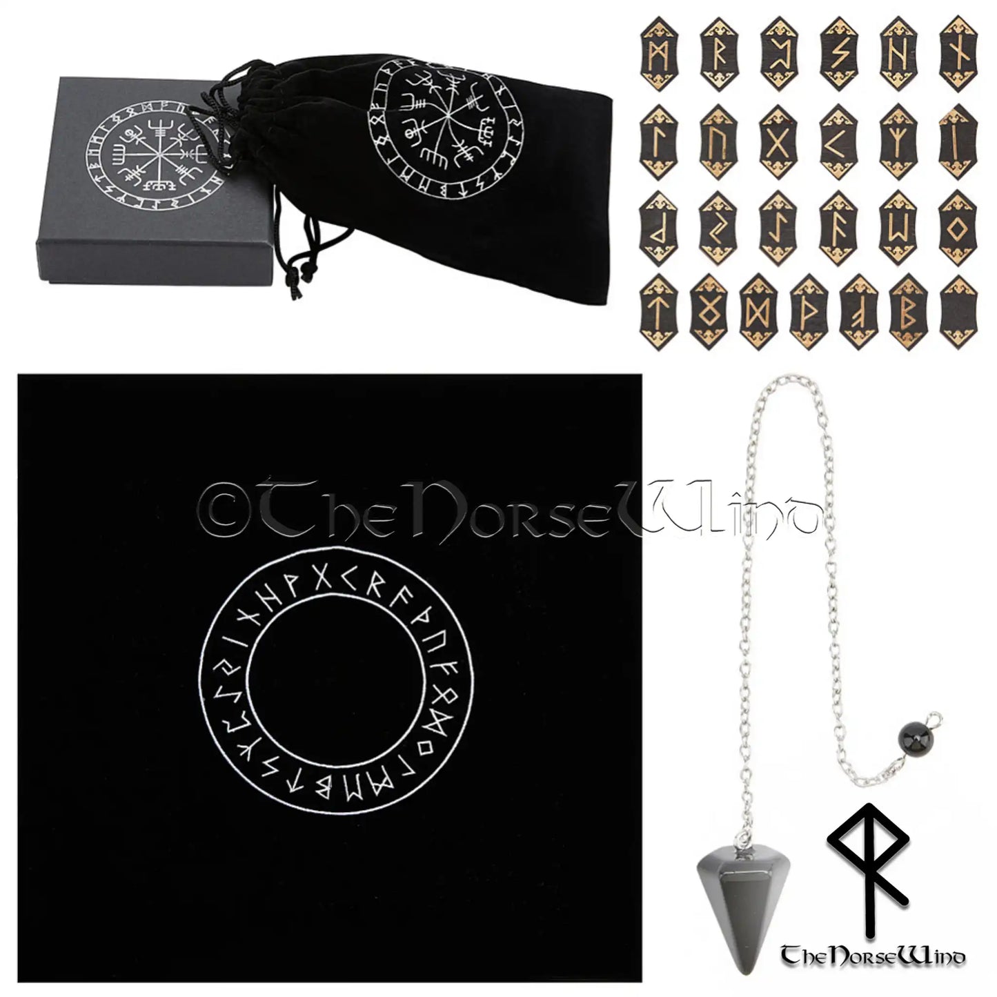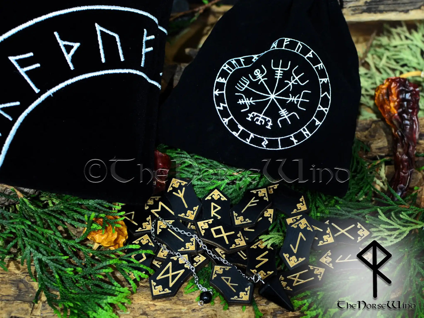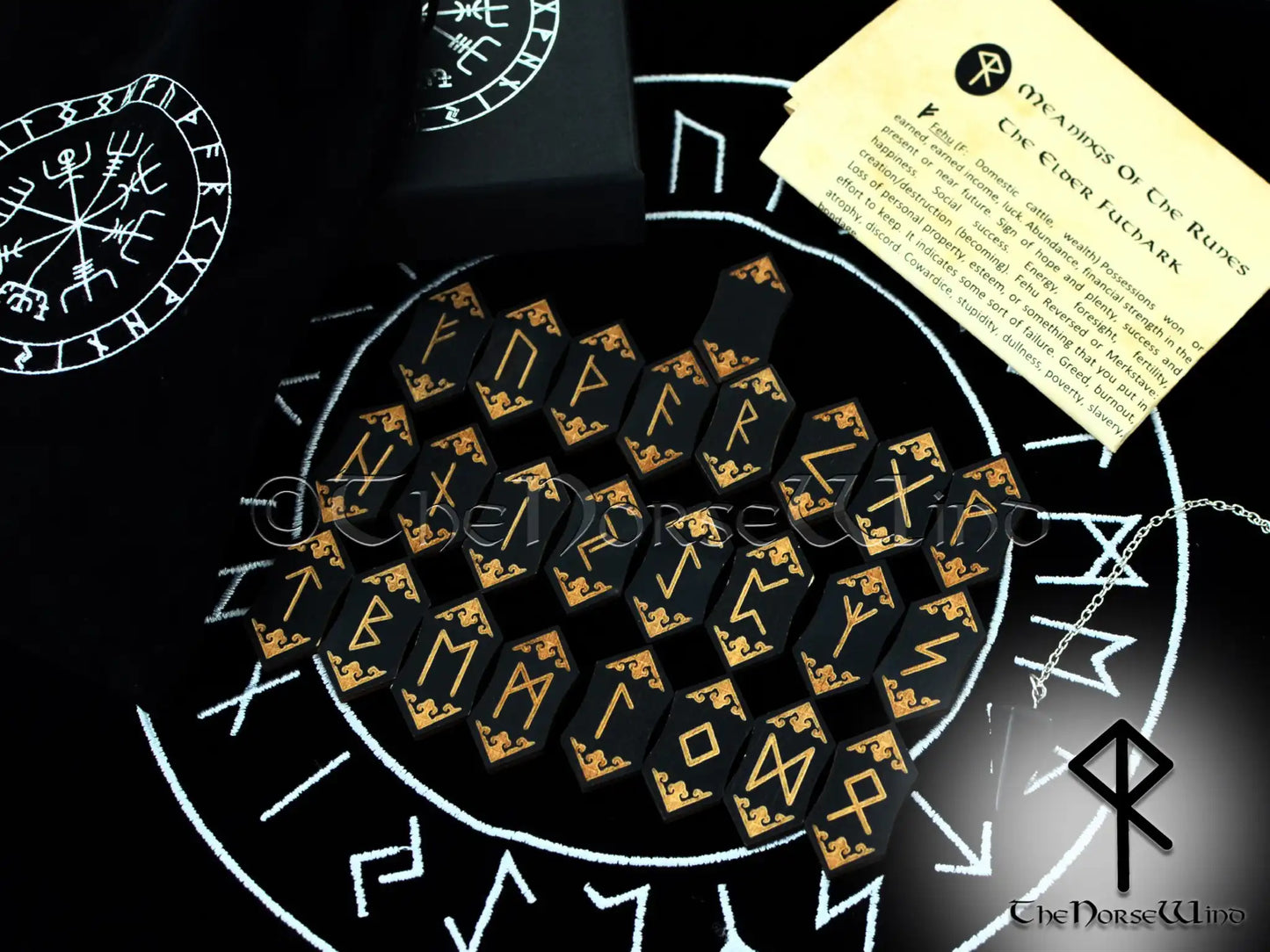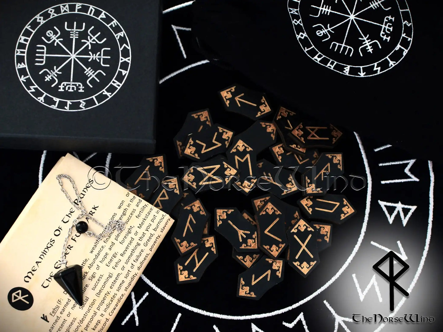 Black Wooden Elder Futhark Runes Set with Vegvisir Pouch or Box - Add-On Pendulum & Altar Rune Cloth