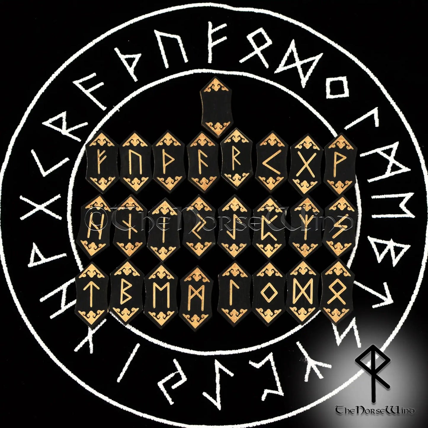 - Authentic Elder Futhark Runes Set with 24 black wooden tiles + Blank Rune