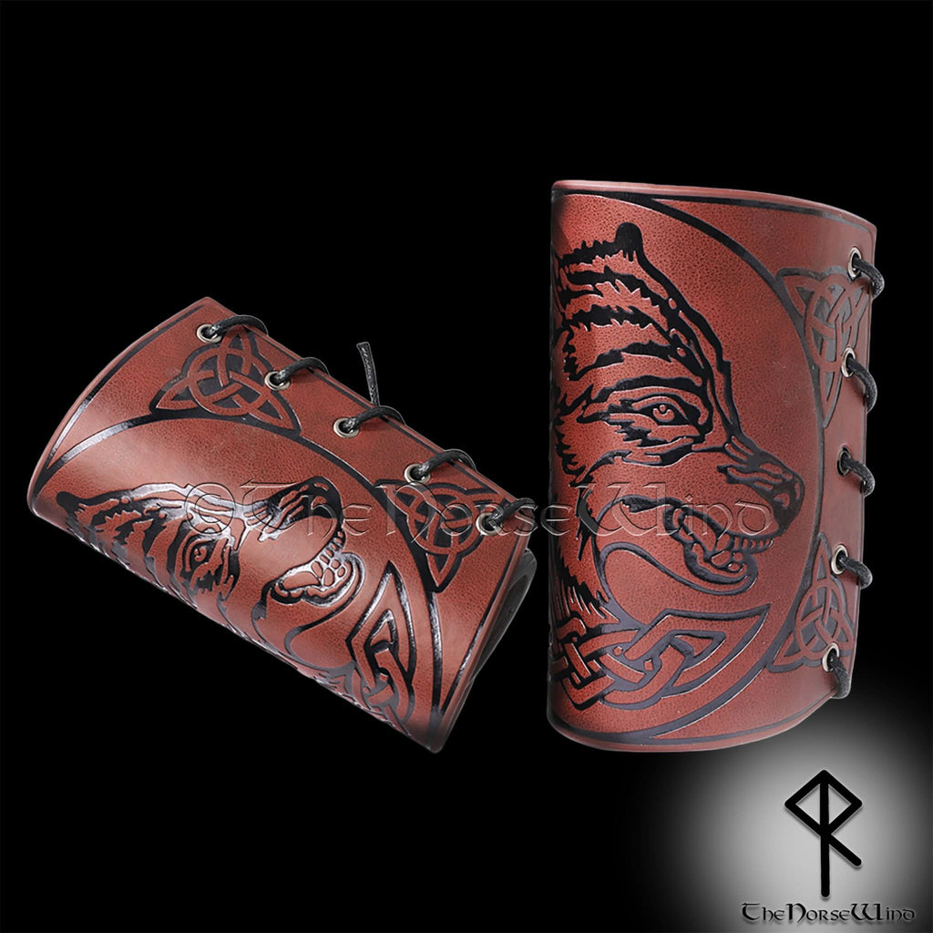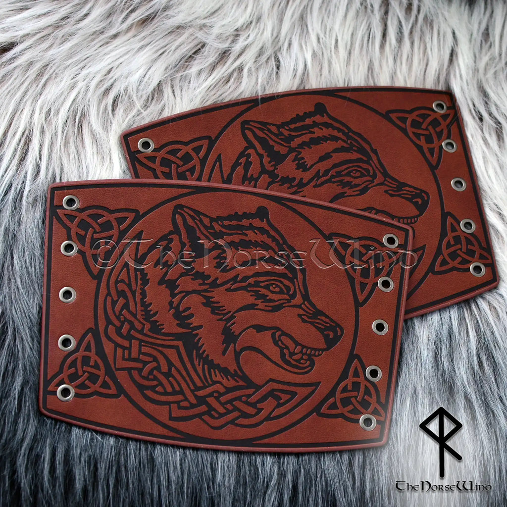 Fenrir Wolf Viking Bracers, Medieval Norse Arm Guards in Brown