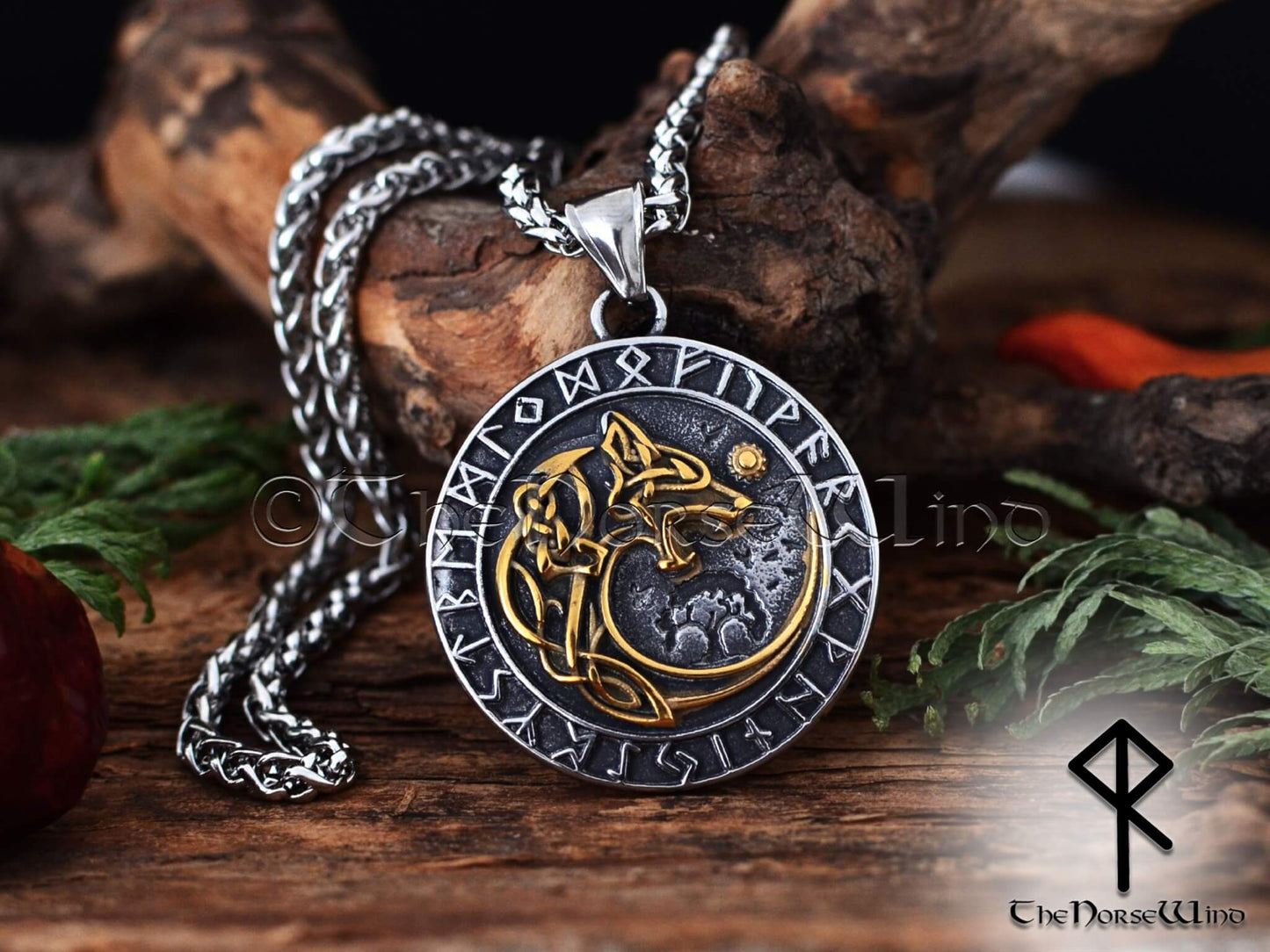 Fenrir Wolf Viking Pendant, Norse Runes Necklace Silver/Gold