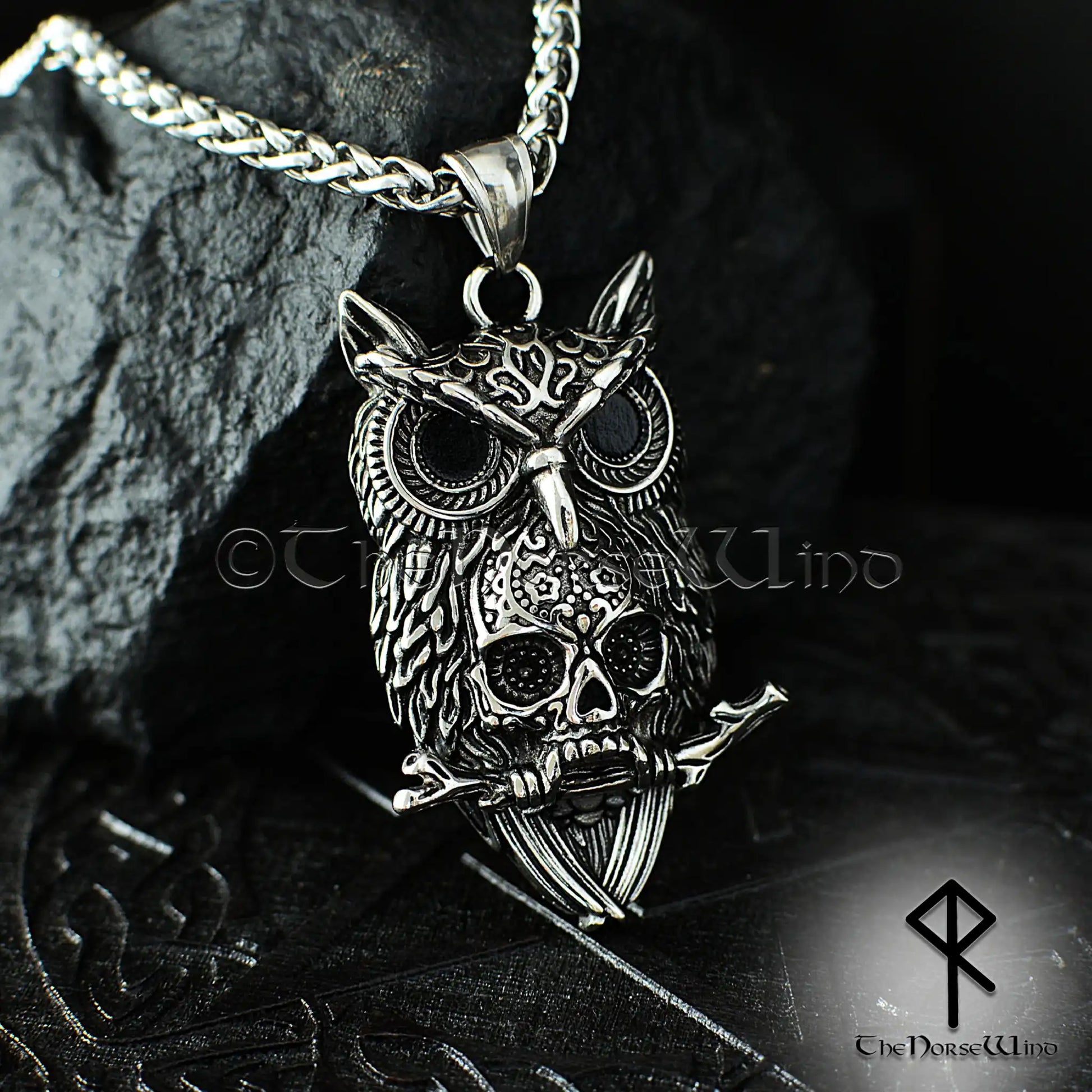 Gothic Owl Skull Necklace, Dark Occult Pendant, Stainless Steel
