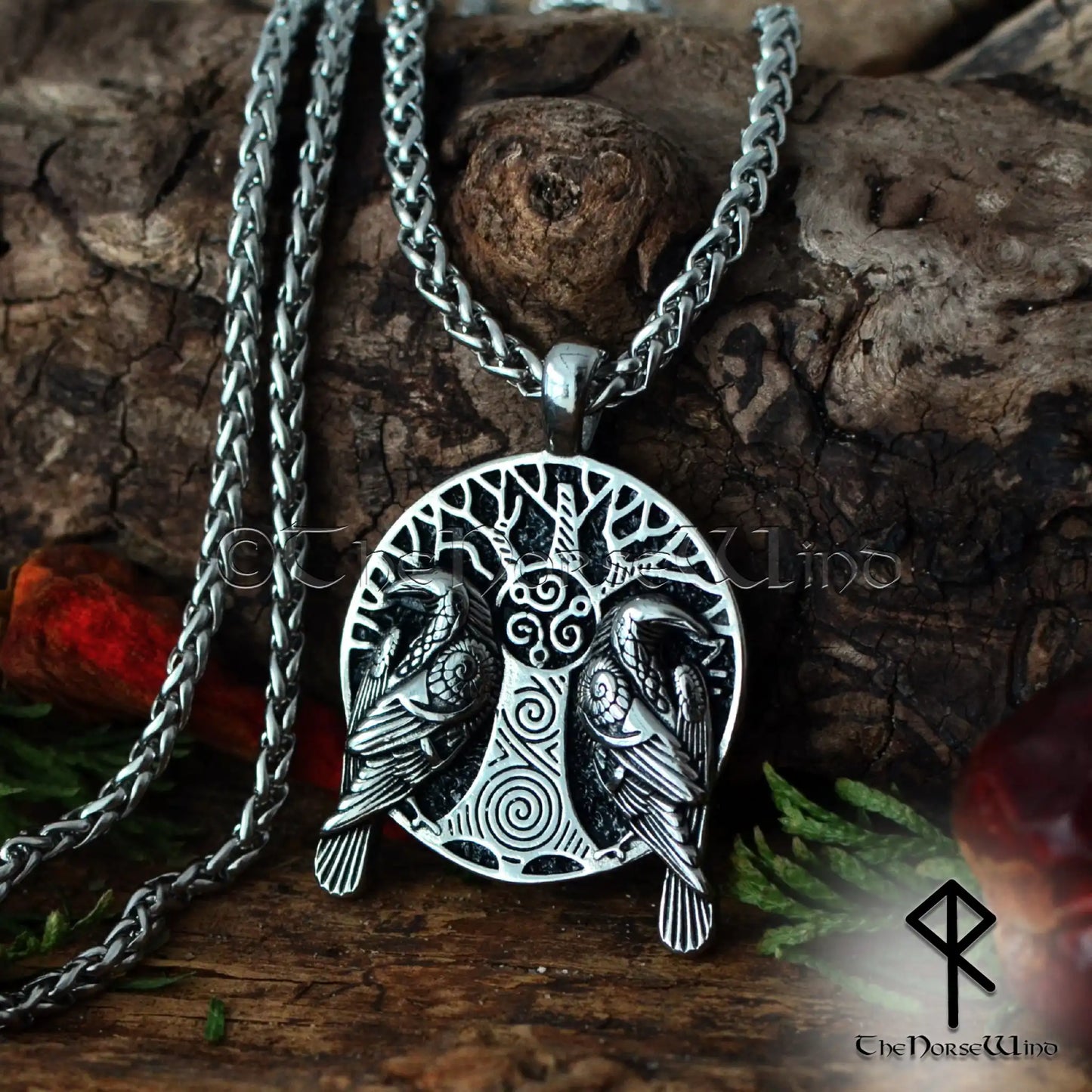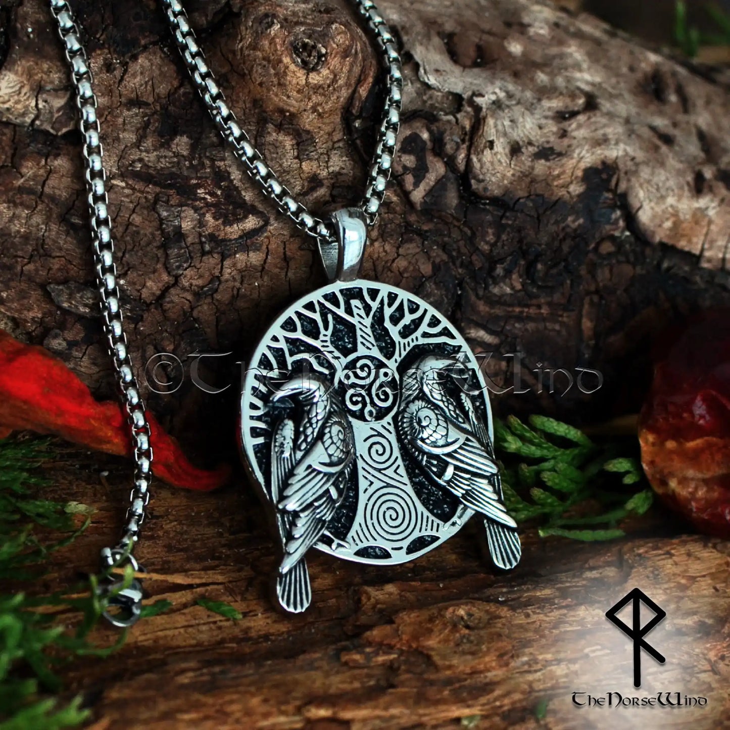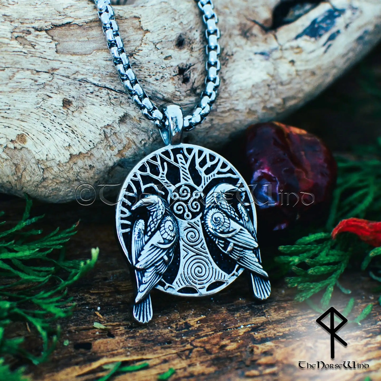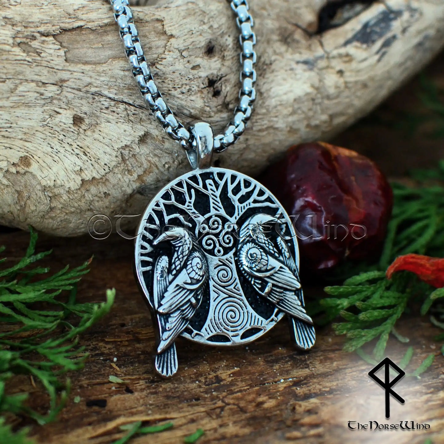 Viking Raven Necklace Huginn and Muninn Norse Pendant, Stainless Steel