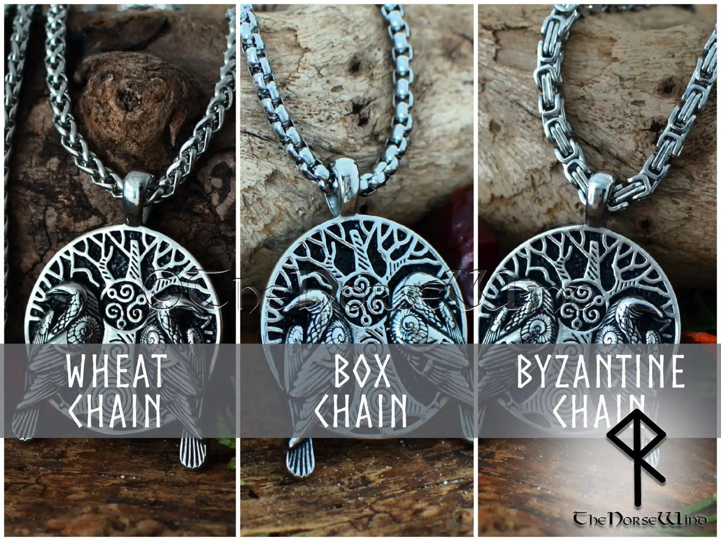 Choose from three chain variations – the sturdy wheat chain, the daring box chain, or the intricate Byzantine chain – to complement your style and embody the resilience of Norse warriors.