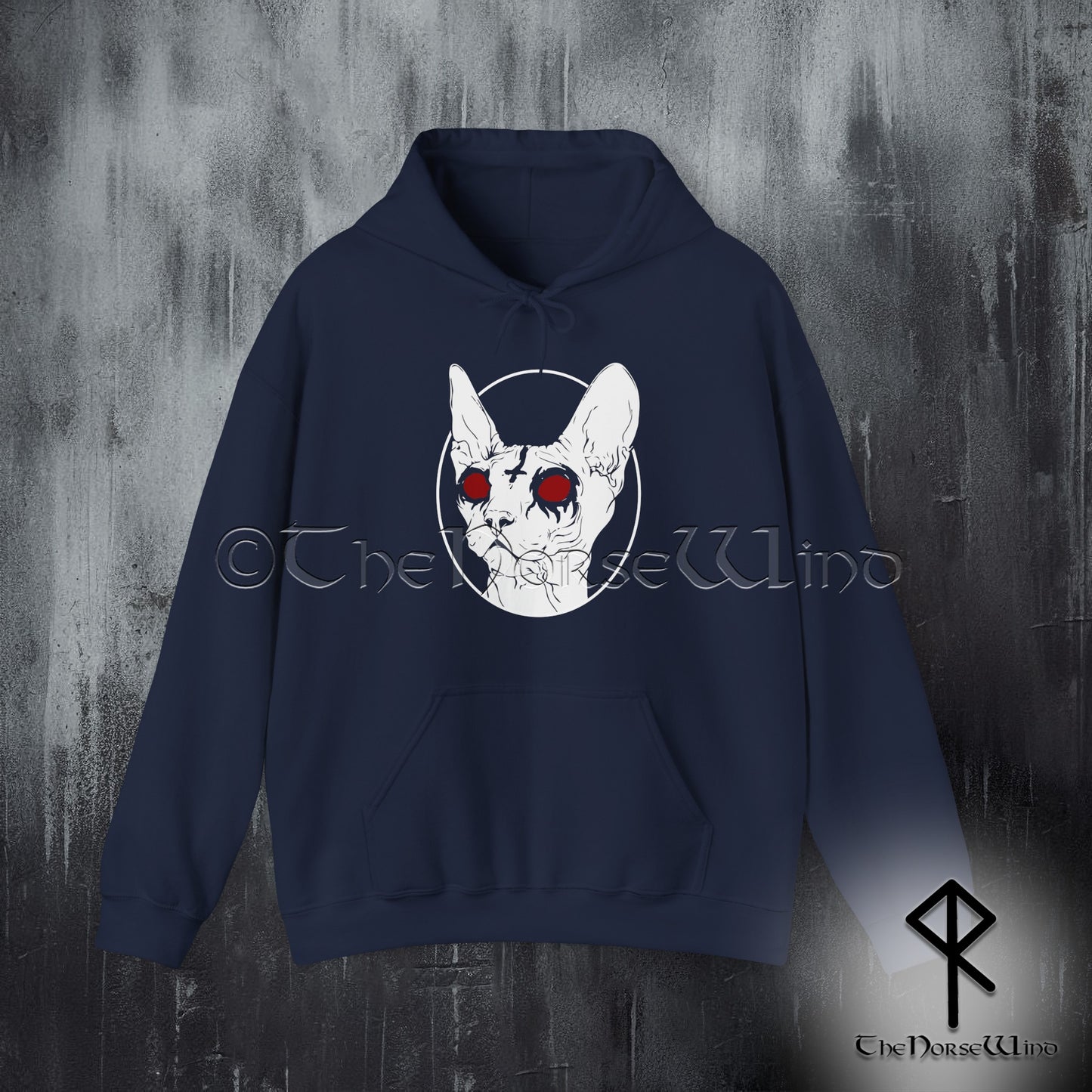 Embrace the darkness with this Sphynx Cat Gothic Hoodie, a perfect blend of occult aesthetics, black metal vibes, and alternative darkwear. Featuring a striking hairless cat with glowing red eyes and an inverted cross, this hoodie is designed for those who live by the mystical, eerie, and extreme.
