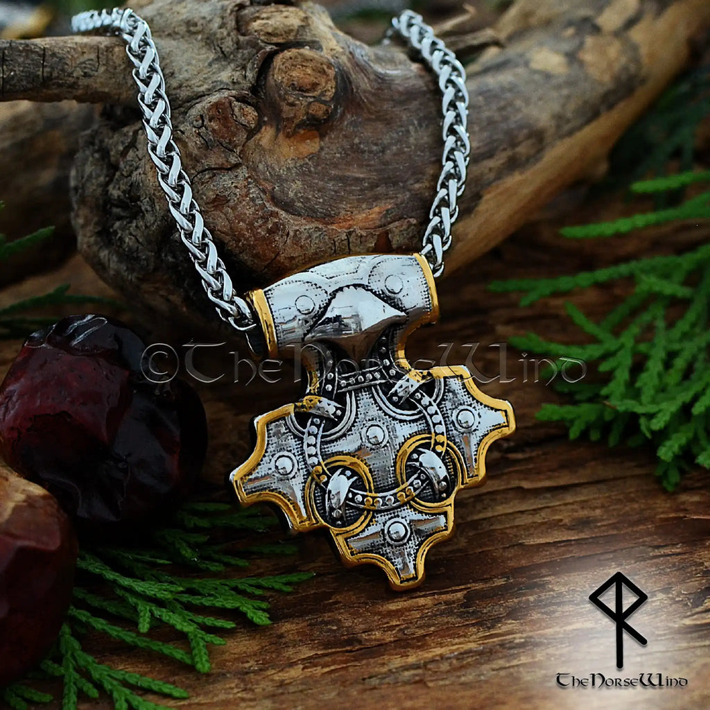 Thor's Hammer Viking Raven Necklace, Mjolnir Pendant in Silver & Gold