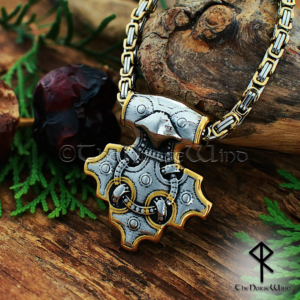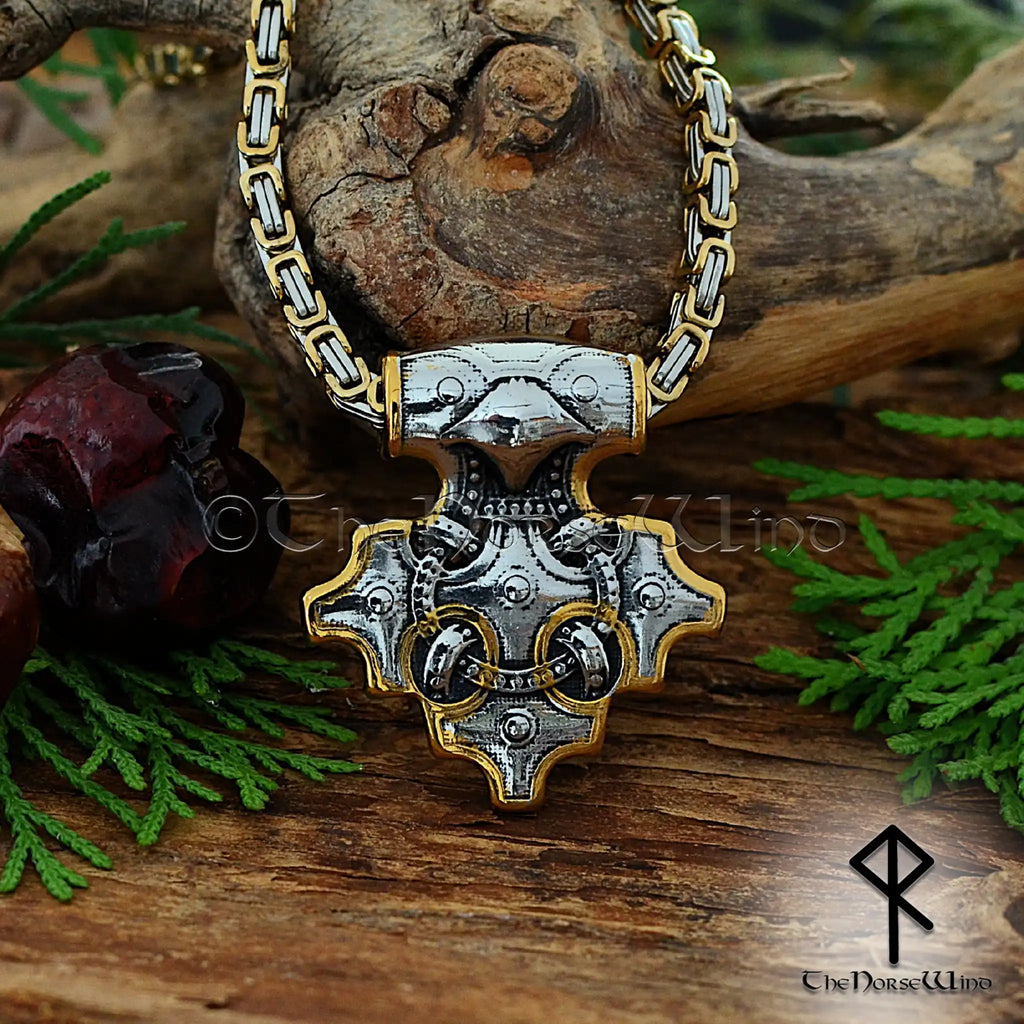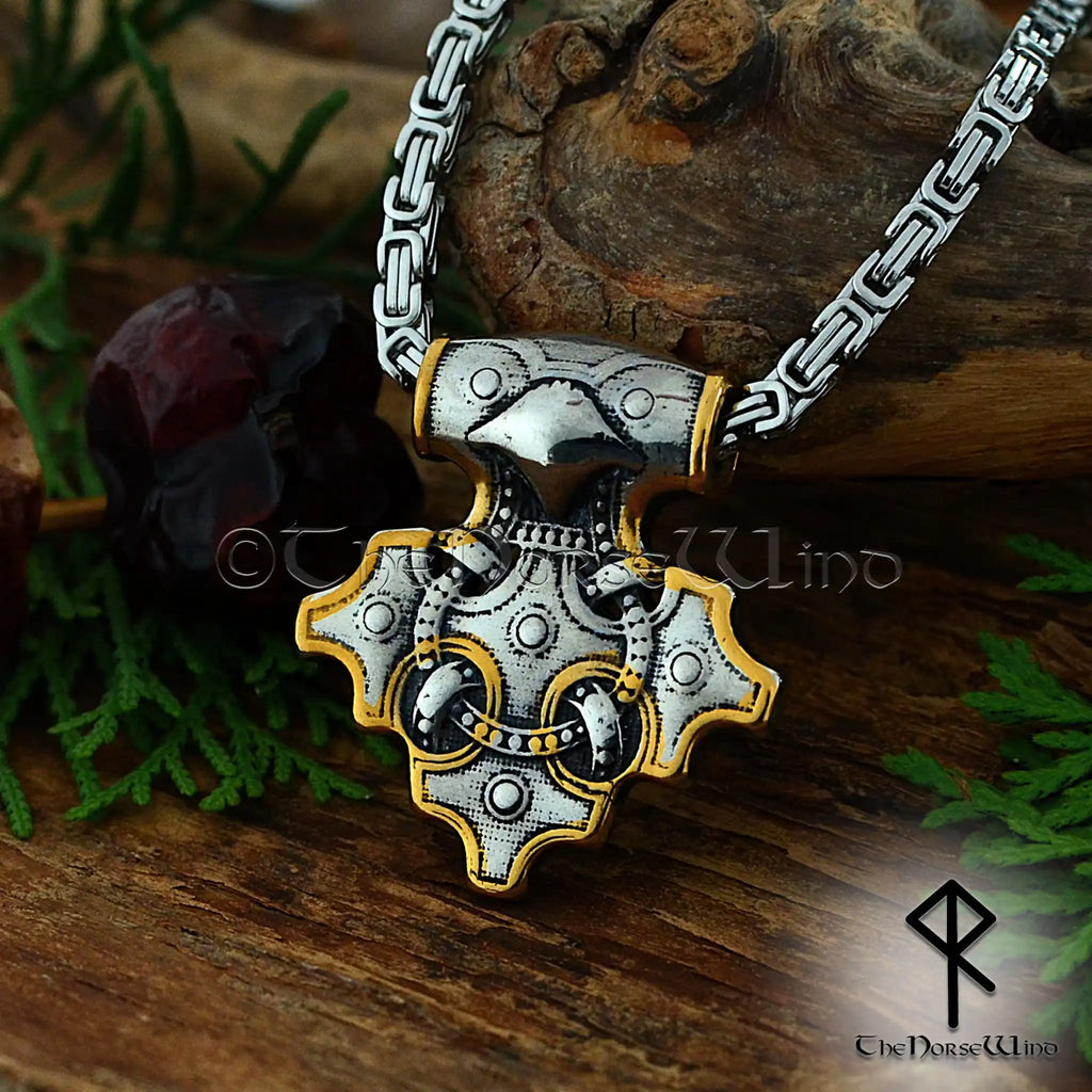 This Mjolnir pendant in silver and gold is a powerful symbol of strength and protection. Let it guide and empower you through any challenges you may face. Perfect for any warrior or fan of Norse mythology.