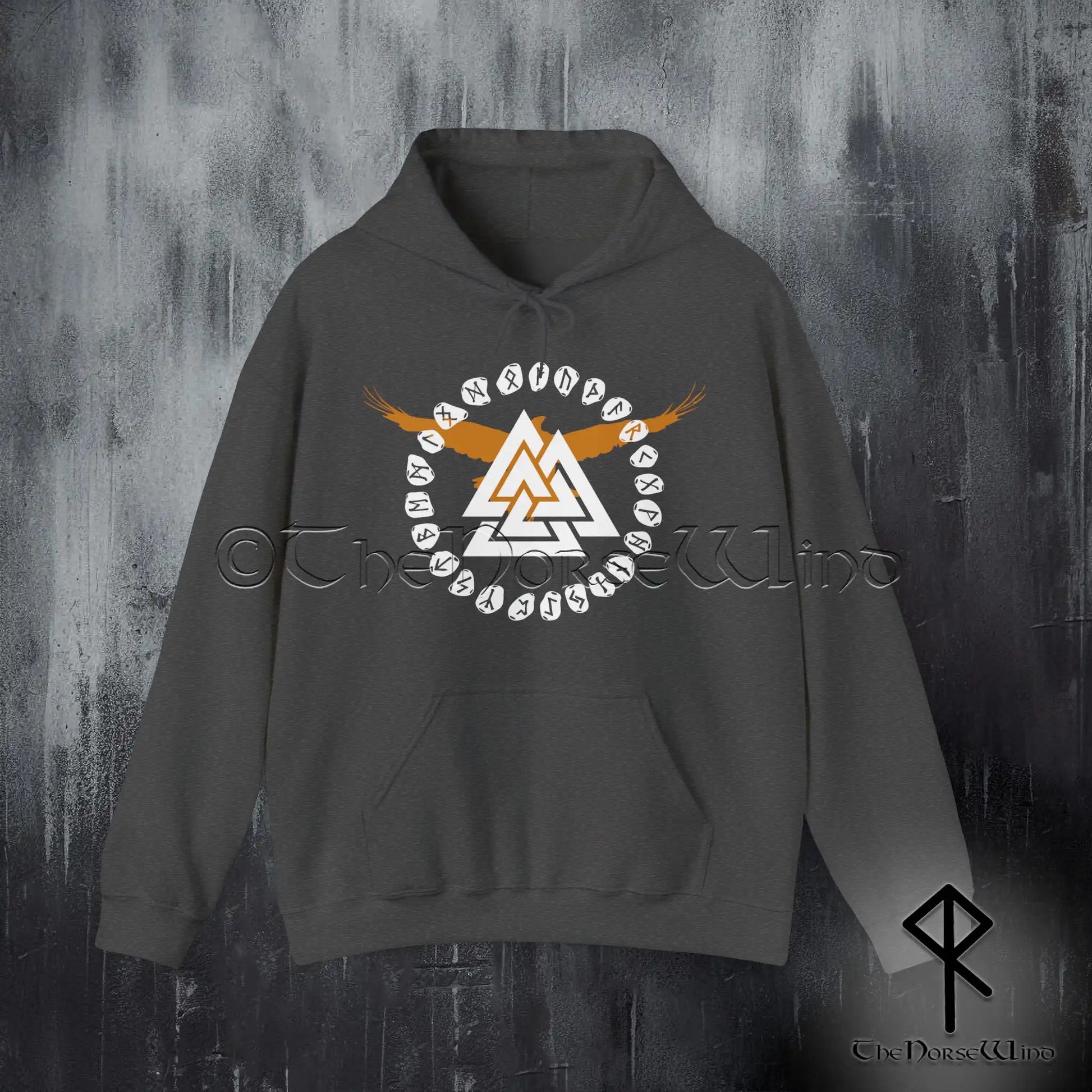Valknut Viking Hoodie Pullover, Death Knot Runes Sweatshirt with Odin's Raven