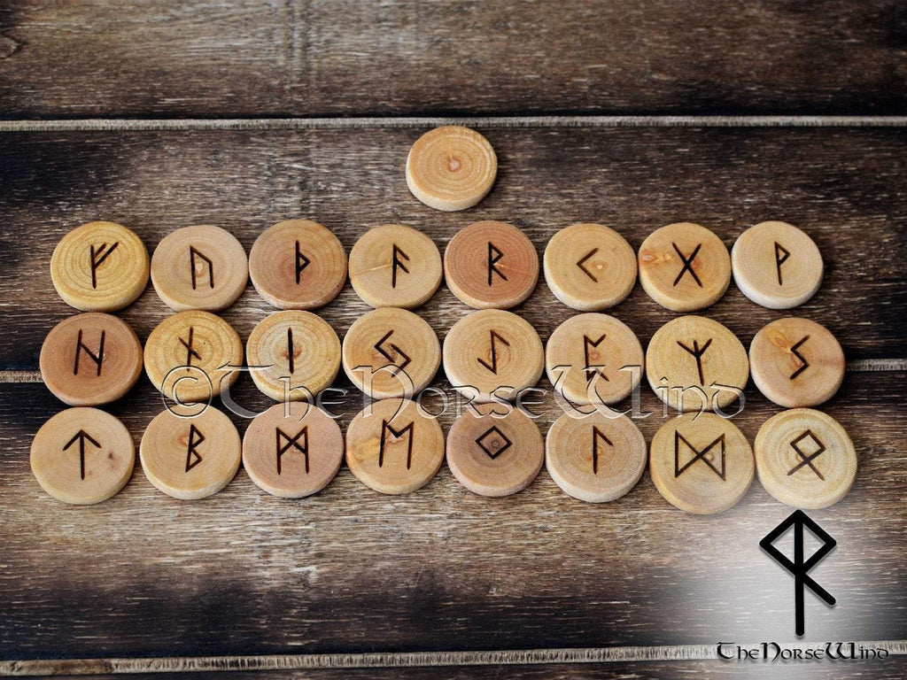 - 24 hand pyrographed Runes and the Blank rune (each rune' size: approx. 0.5 - 0.8 inch/ 1.5-2 cm diameter)