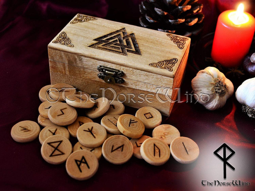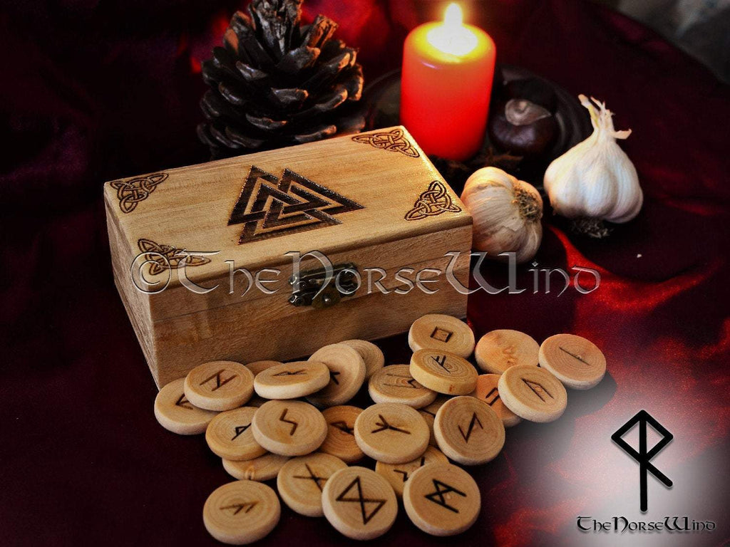 Viking Rune Set + Valknut Altar Box, Elder Futhark Runes Odin Chest Norse Runes Asatru Wooden Runes Norse Mythology Wicca Pagan