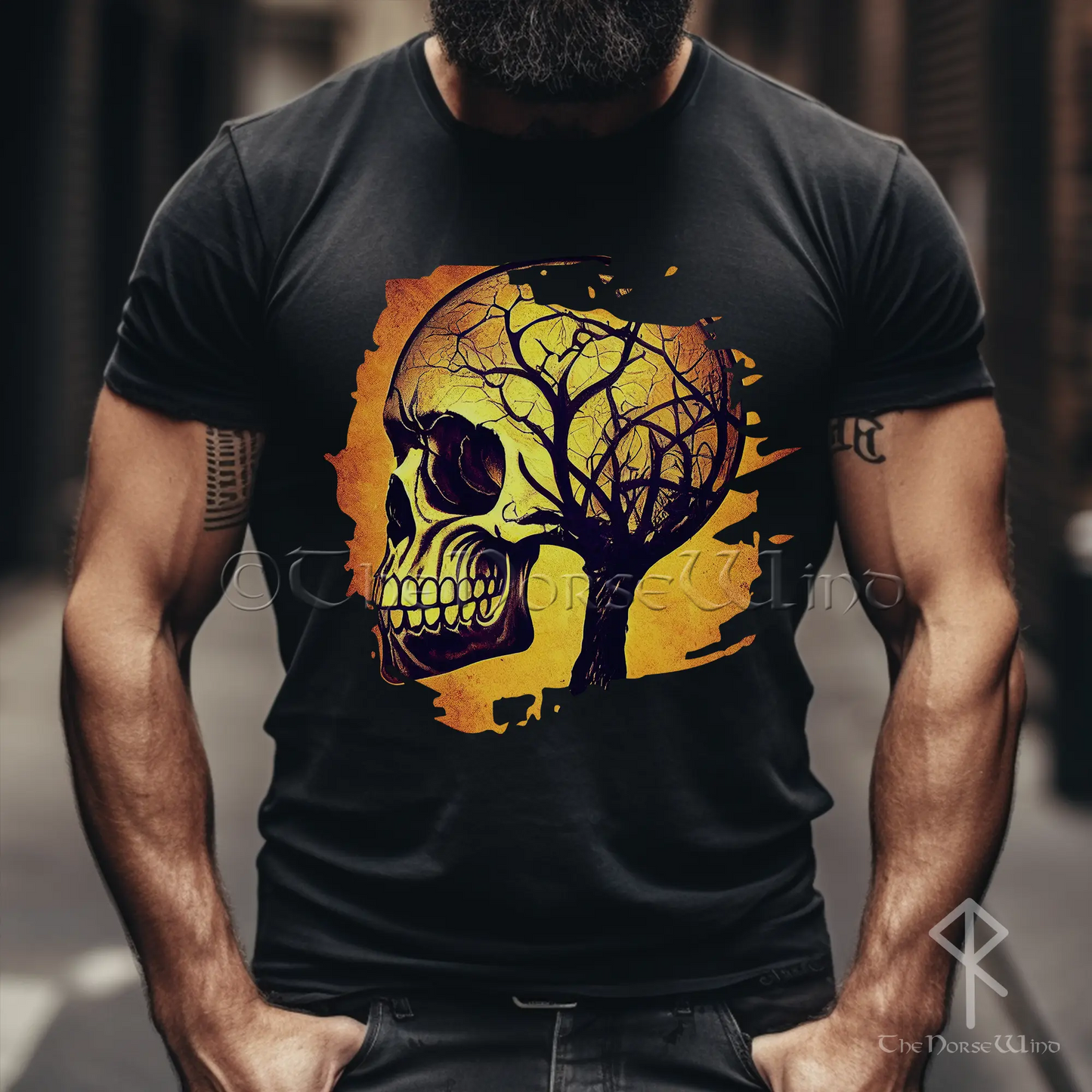 Viking Skull T-Shirt with Yggdrasil Celtic Tree of Life in Fire
