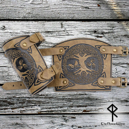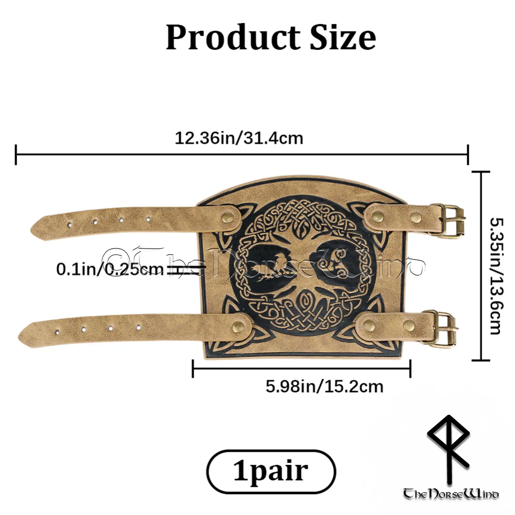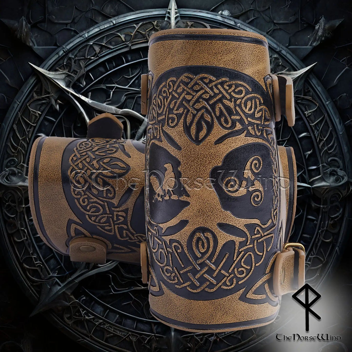 These 2-piece leather bracers are adorned with a richly embossed design featuring the World Tree Yggdrasil, flanked by Huginn and Muninn, Odin’s watchful ravens. At the other side lies the Triskelion, symbol of motion, cycles, and divine energy, surrounded by detailed Celtic knotwork that weaves the eternal connection between realms.