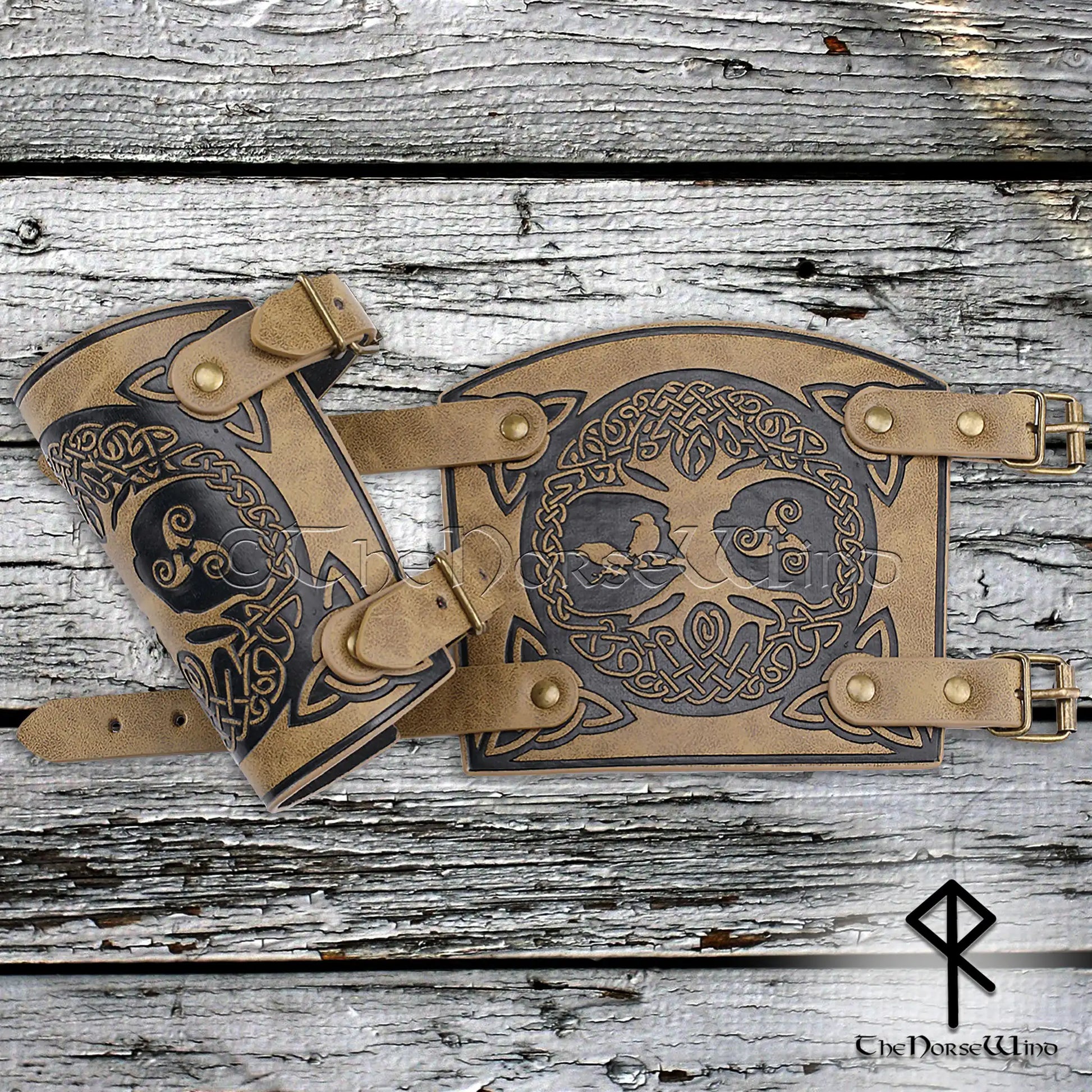 Yggdrasil Viking Leather Bracers – Norse Raven Arm Guards with Huginn and Muninn